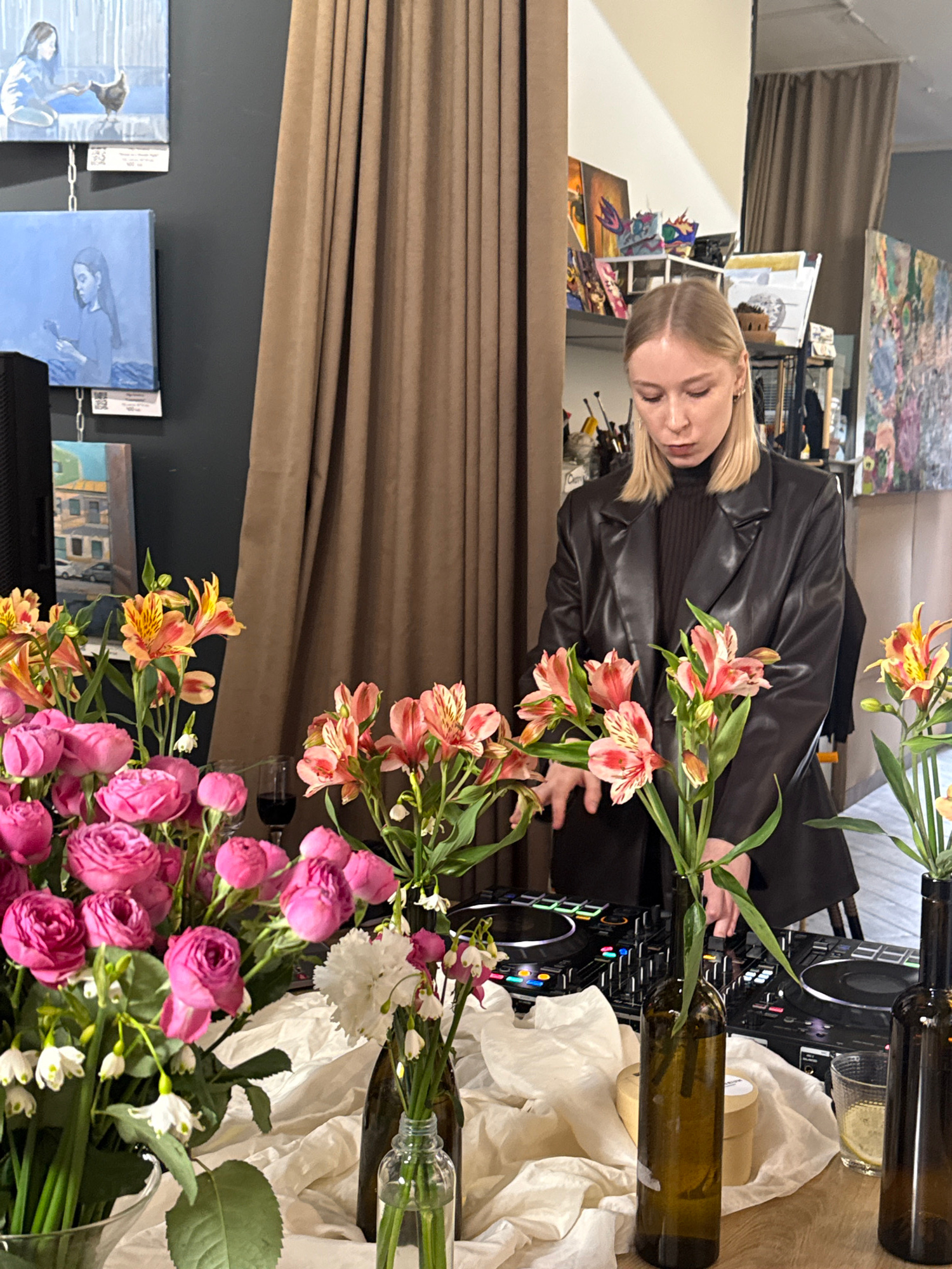 A photograph captures a woman with fair hair, wearing a dark leather jacket, bent over a DJ mixer setup. Flowers in varying shades of pink, red, and white are arranged in vases fashioned from repurposβ¦read more