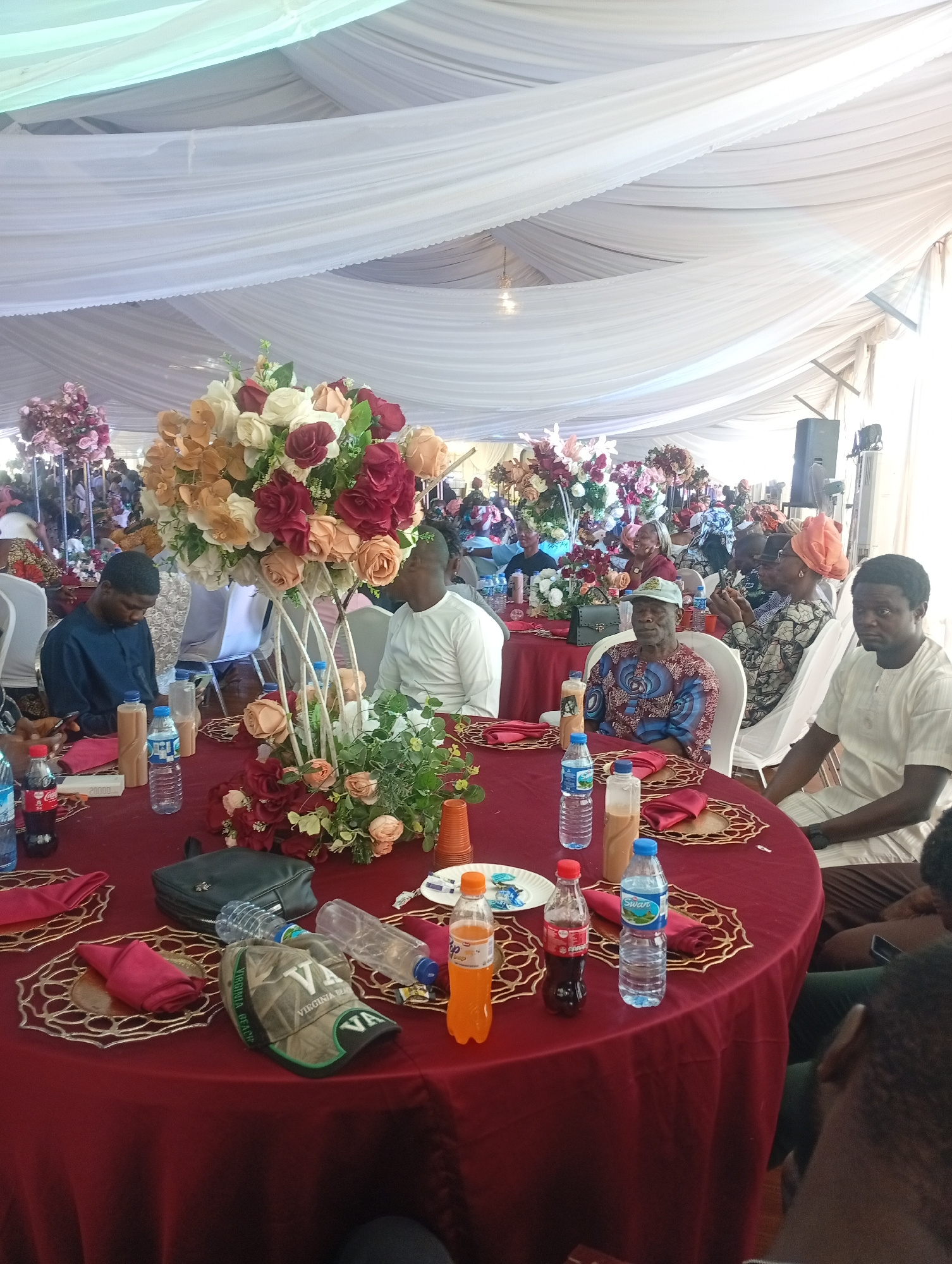 The image shows an indoor event, likely a wedding or celebration, taking place under a large tent draped with white fabric. Multiple round tables covered with red tablecloths are arranged throughout t…read more