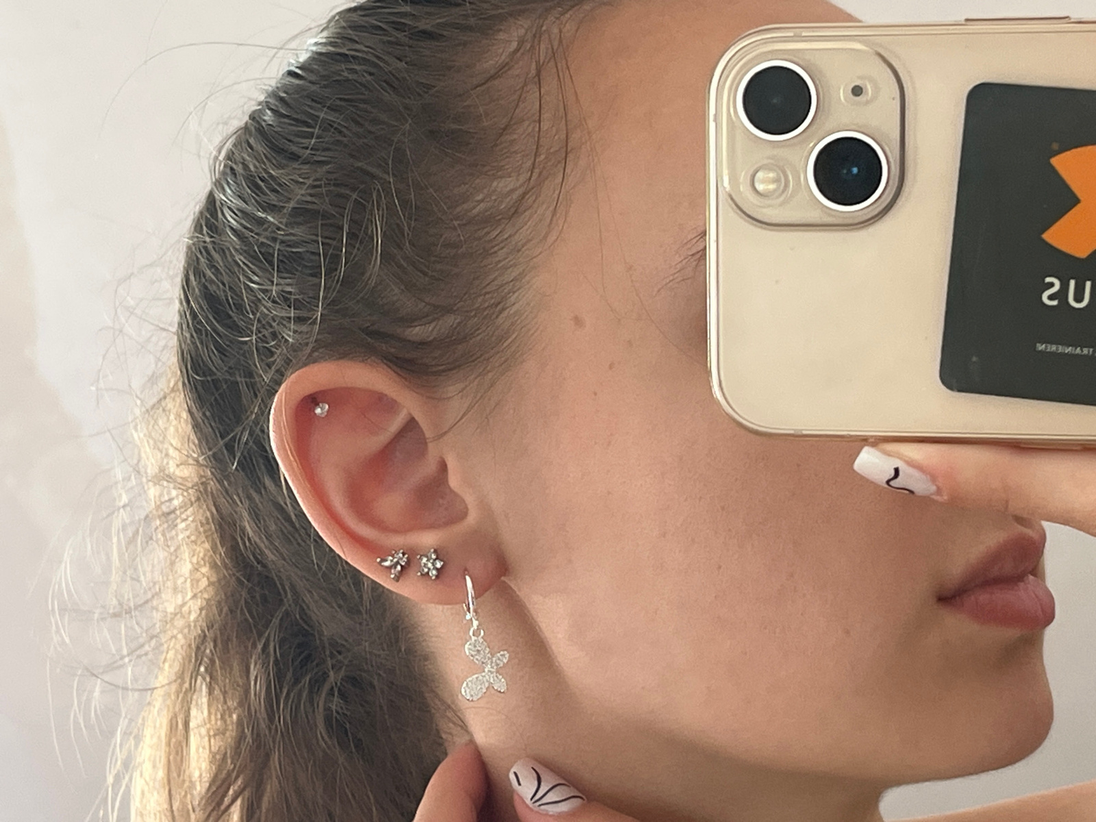 A close-up, right-profile image shows a person holding a smartphone in front of their face. The smartphone, an iPhone with a gold frame, partially obscures the face, revealing the cheek, lips, and a g…read more
