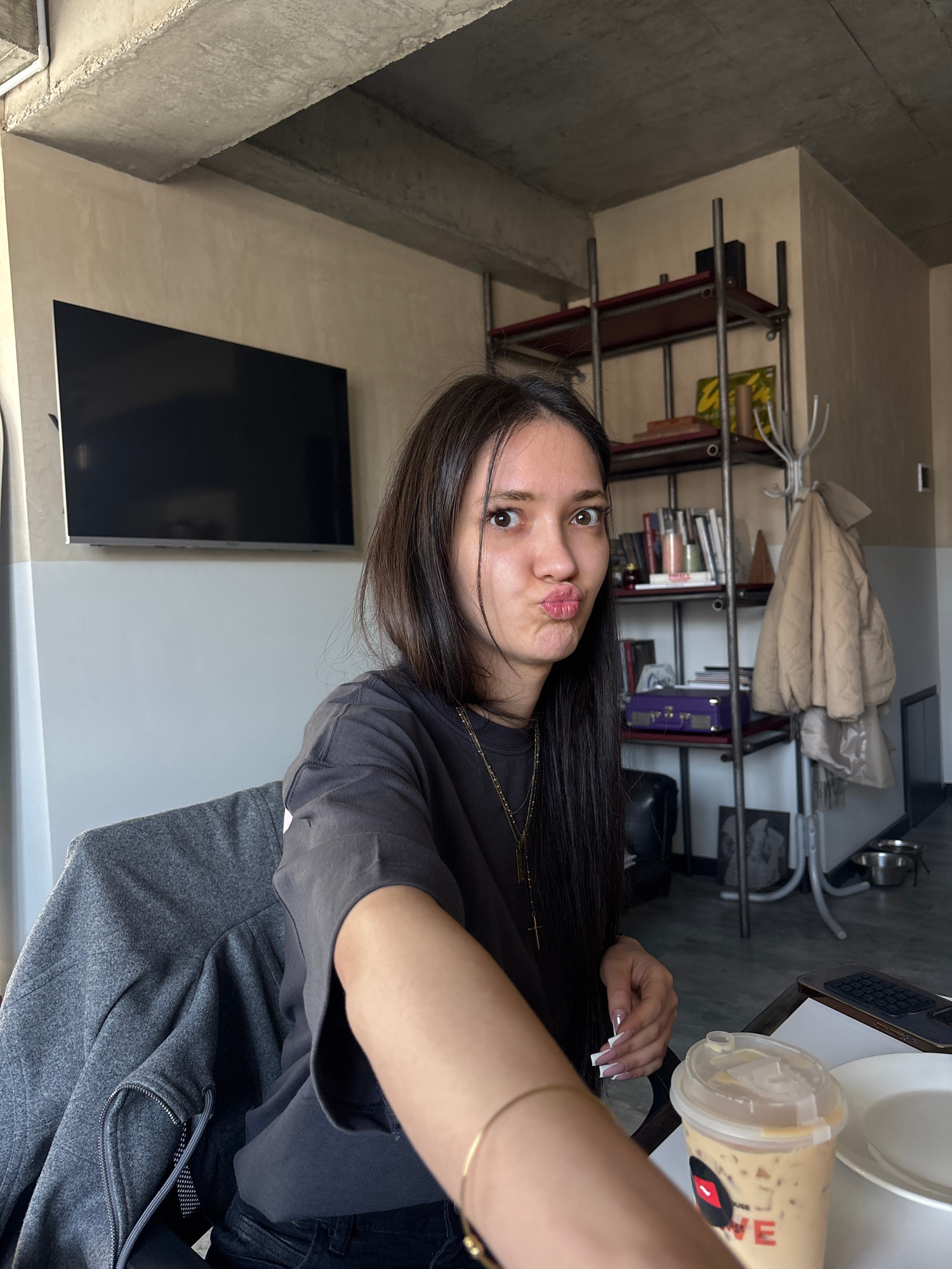 The image depicts a young woman indoors, possibly in an apartment or cafe. She is holding a beverage, likely an iced coffee or similar drink. A shelf with books and other items is visible in the backg…read more