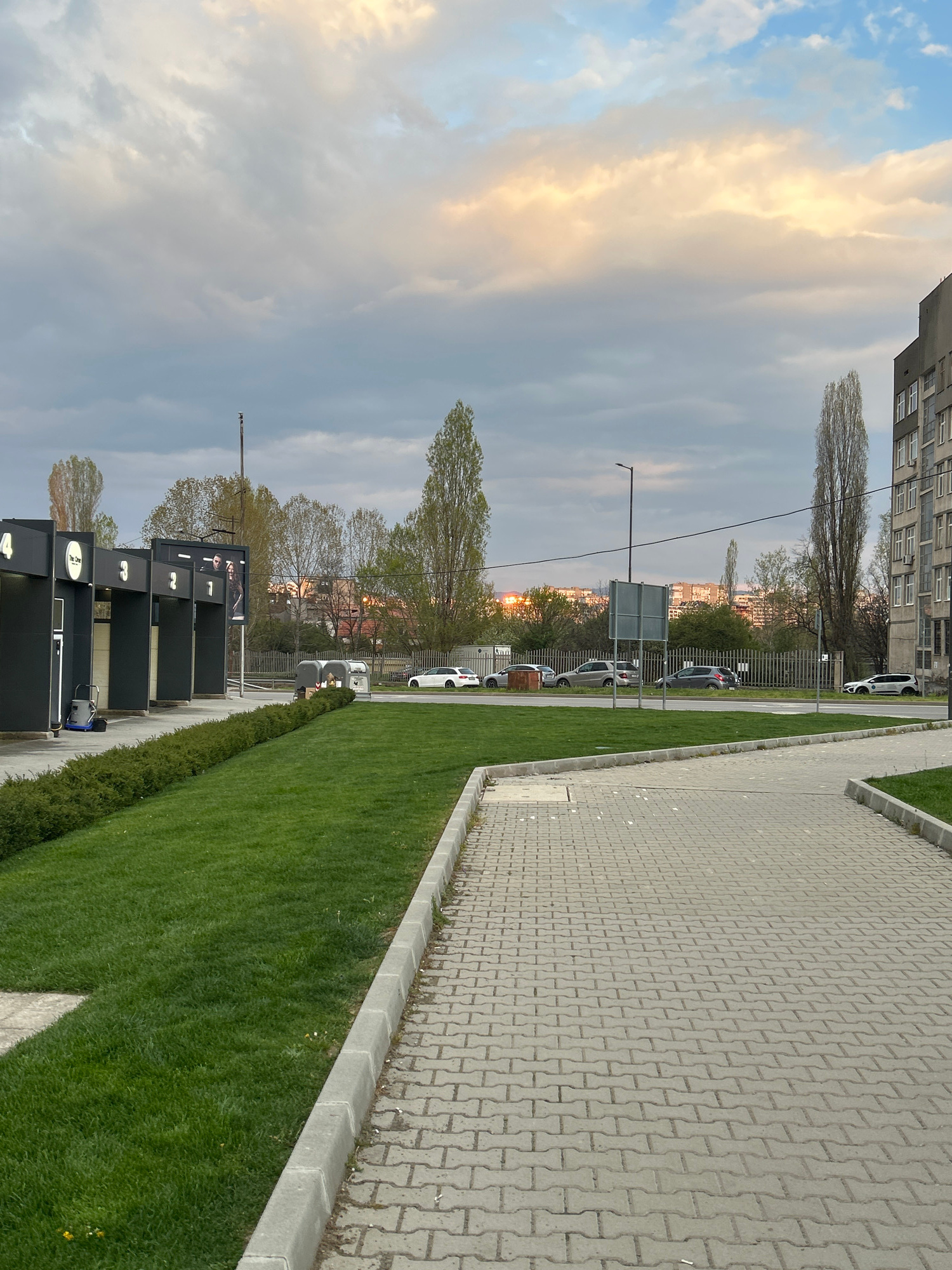 The image displays an urban or suburban street scene, likely in Sofia, Bulgaria, captured during either sunrise or sunset. A patterned concrete block sidewalk forms the foreground, bordered by a strip…read more
