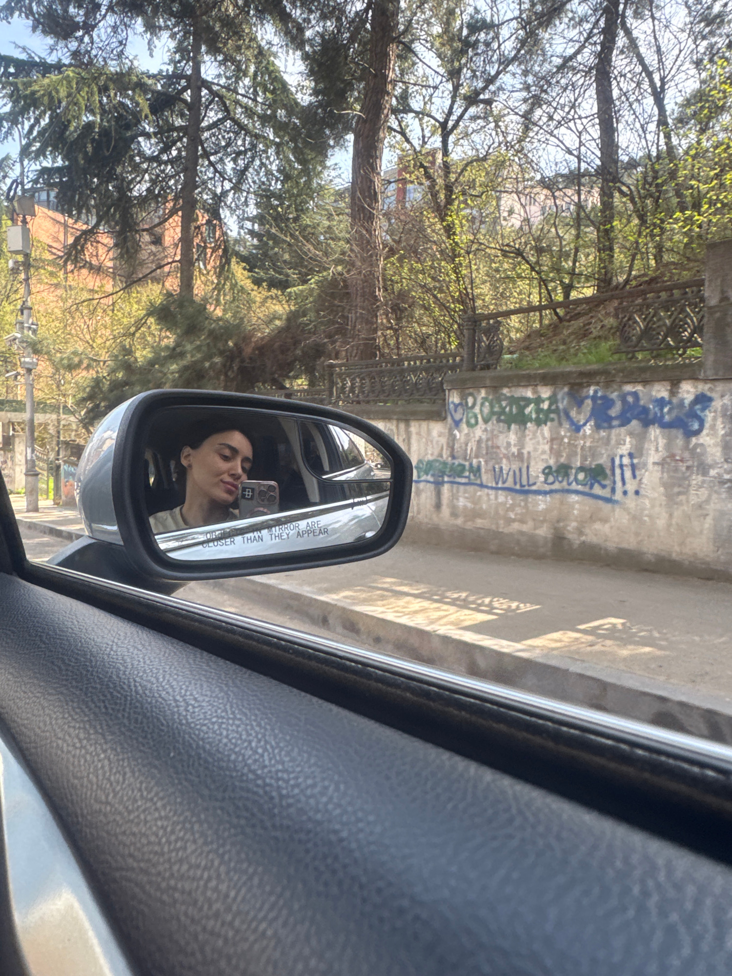 The photograph, taken from inside a car, captures a view reflected in the side mirror and the surrounding environment. In the side mirror, a person is visible, holding a phone to take the picture. The…read more