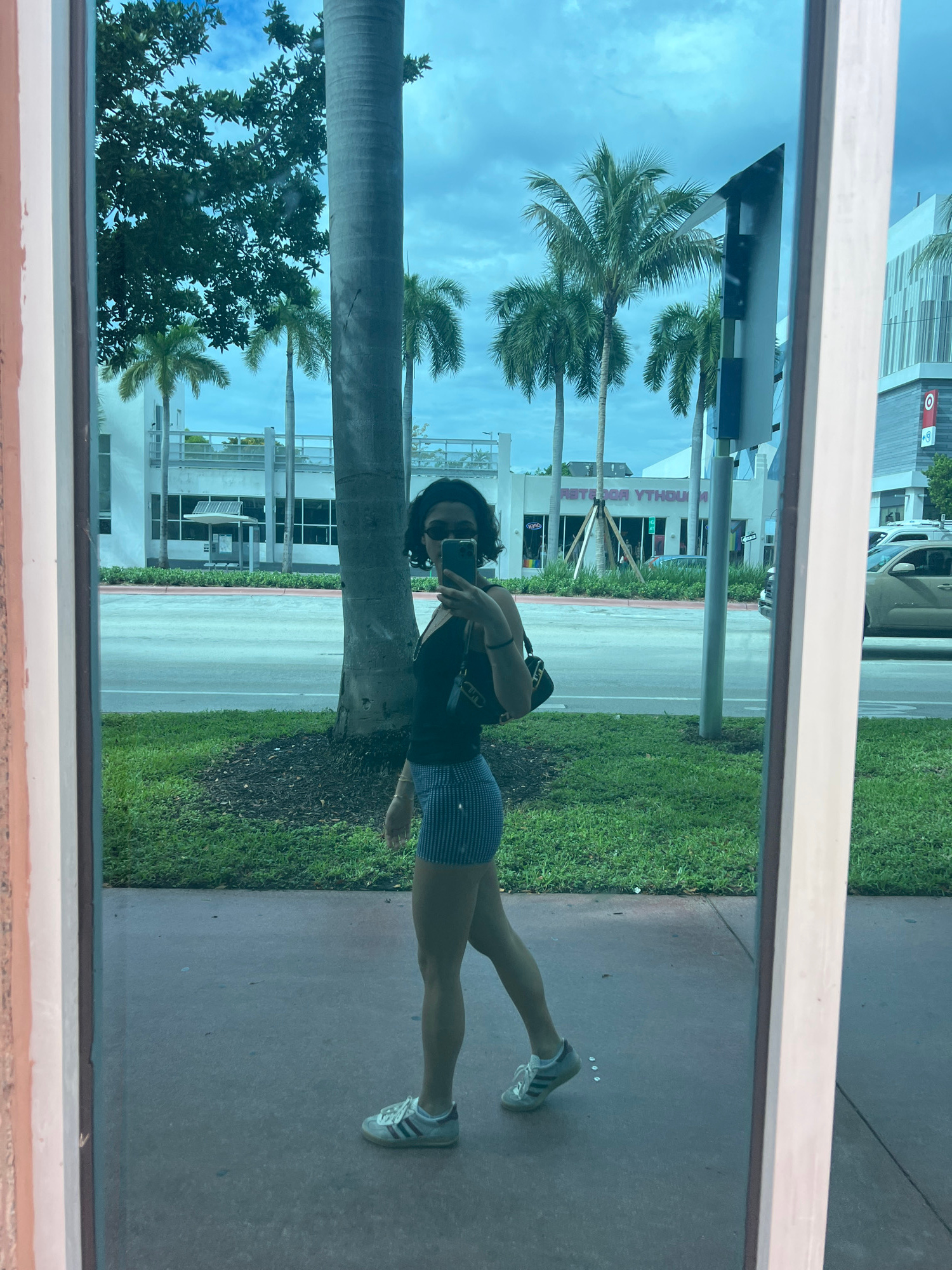 A person stands on a sidewalk in front of a grassy area in Miami Beach, United States of America, reflected in a window. The person is wearing a dark top and denim shorts with Adidas sneakers. They ar…read more