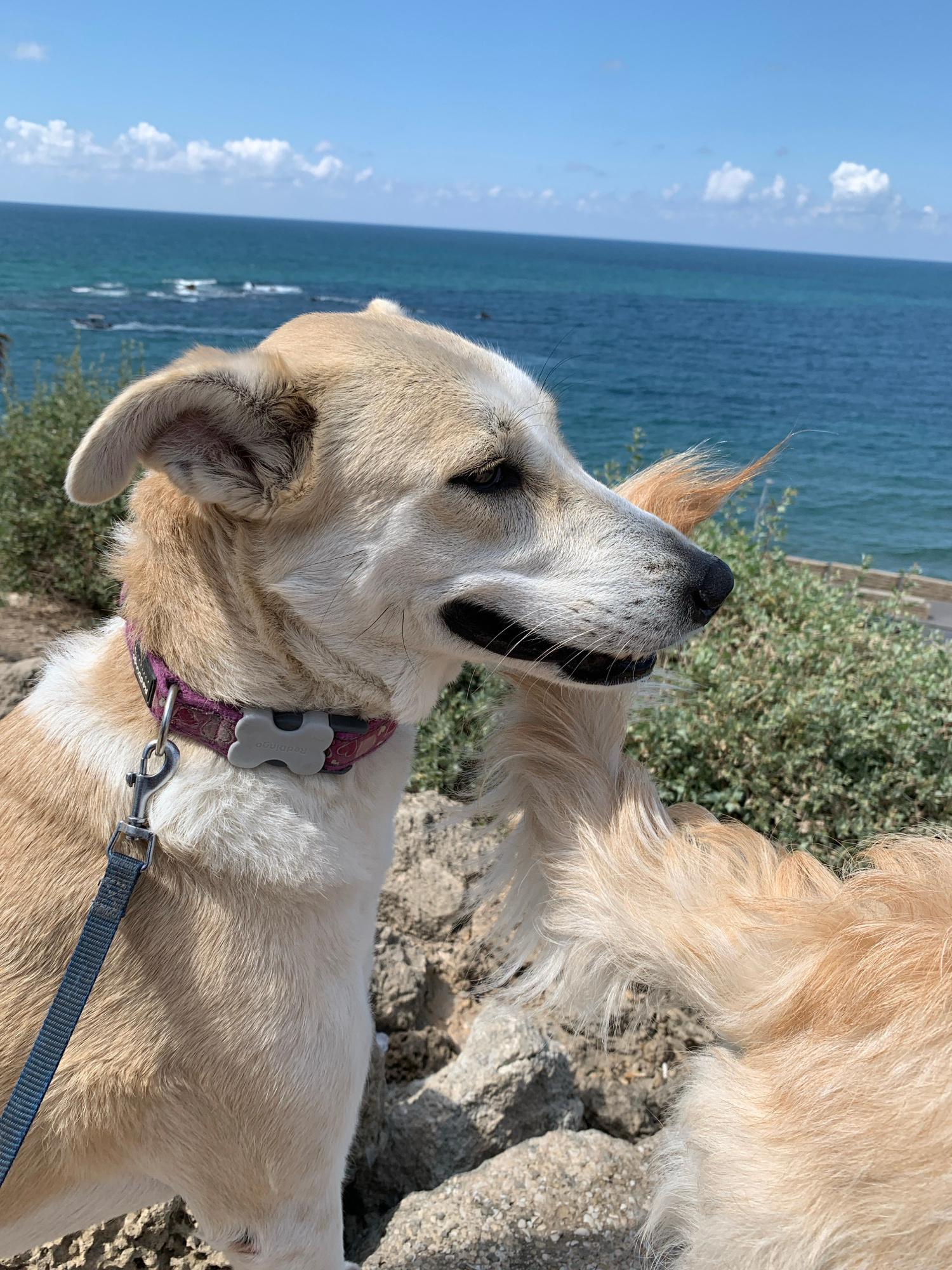 A tan and white dog with a purple collar and blue leash stands near the coast in Tel Aviv, Israel. The Mediterranean Sea stretches to the horizon under a clear blue sky. A second dog, tan with long fu…read more