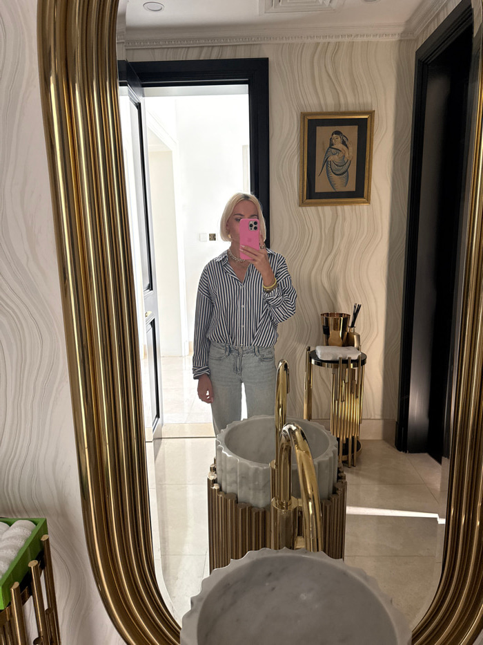 The image depicts a mirror selfie taken by a blonde individual, identified as female, within a luxurious interior space. The subject wears a blue and white striped long-sleeve shirt, light-wash denimβ¦read more