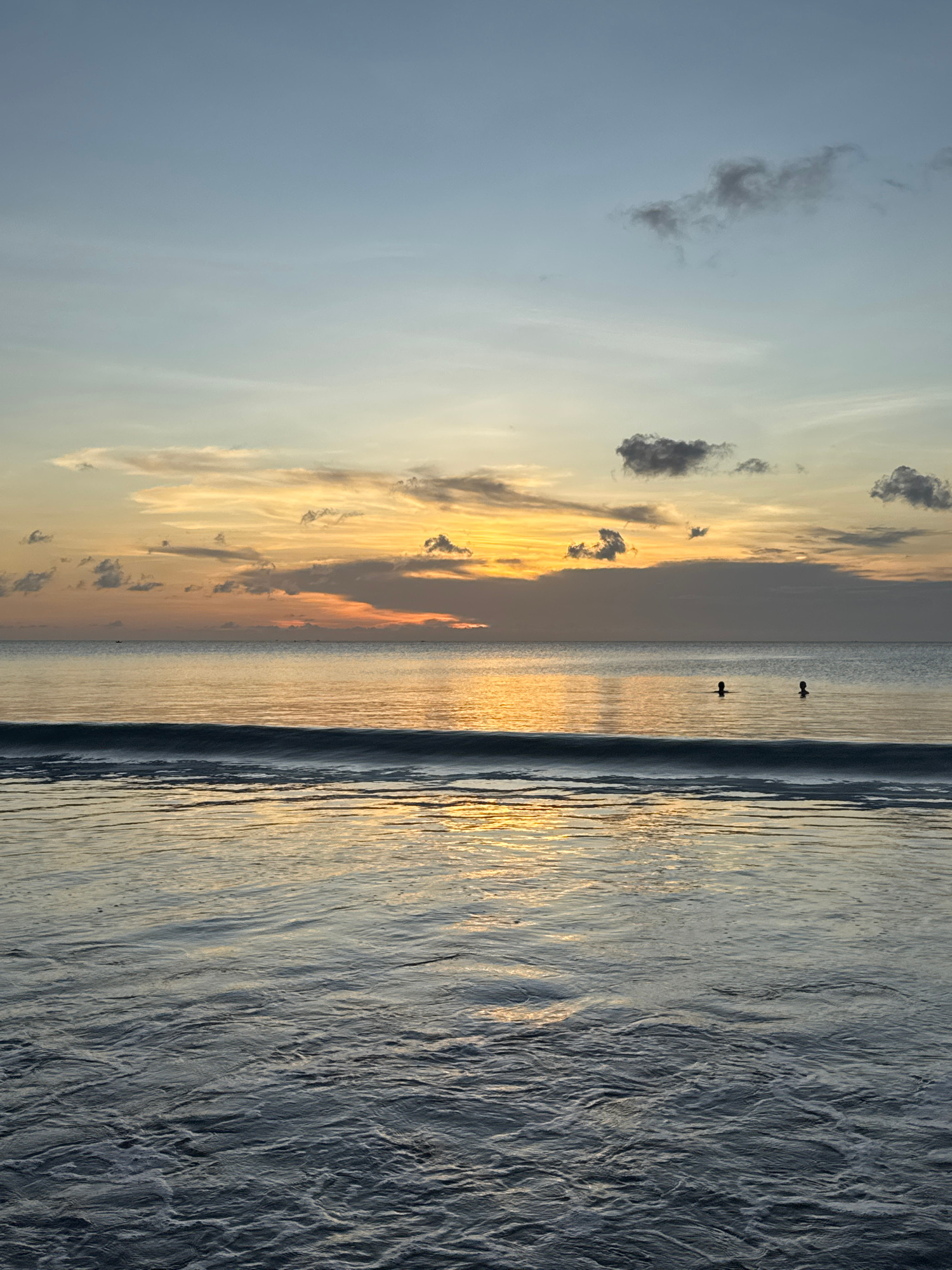 The image depicts a scene at Jimbaran Beach, Indonesia, at sunrise or sunset. The sky on the left is a gradient of blues and yellows, with scattered clouds. The ocean is calm and reflects the light, c…read more