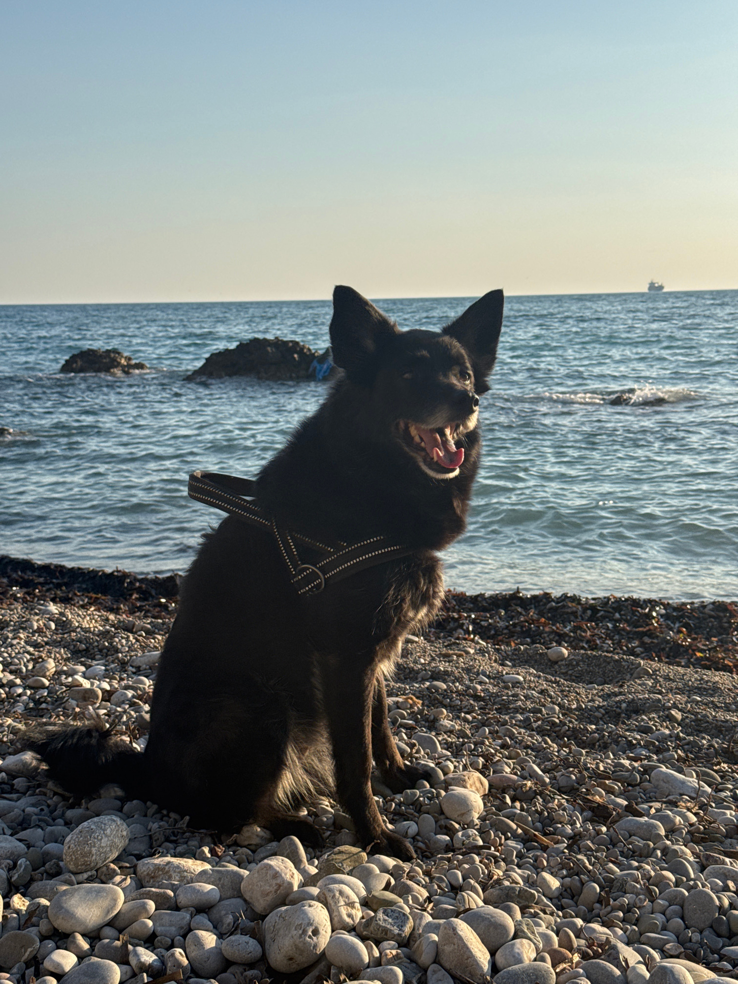 A medium shot depicts a black German Shepherd dog wearing a patterned harness, lying on its side on a rocky beach. The dog's mouth is open, as if panting or barking. The beach consists of gray and whi…read more