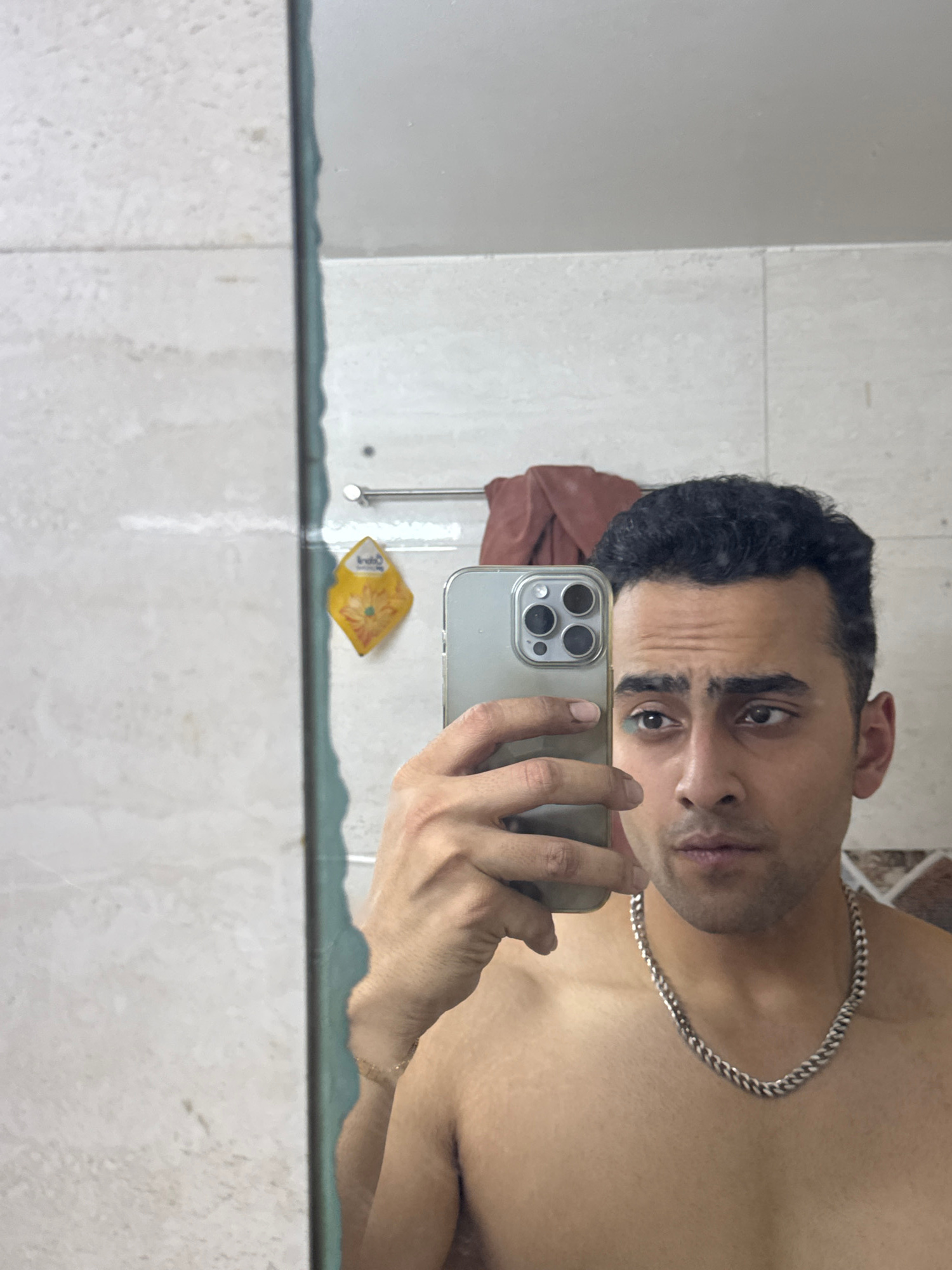 A man is taking a selfie in front of a bathroom mirror. He is shirtless and wearing a silver chain. He is holding a silver iPhone in his right hand. The background includes white tiled walls. A yellow…read more