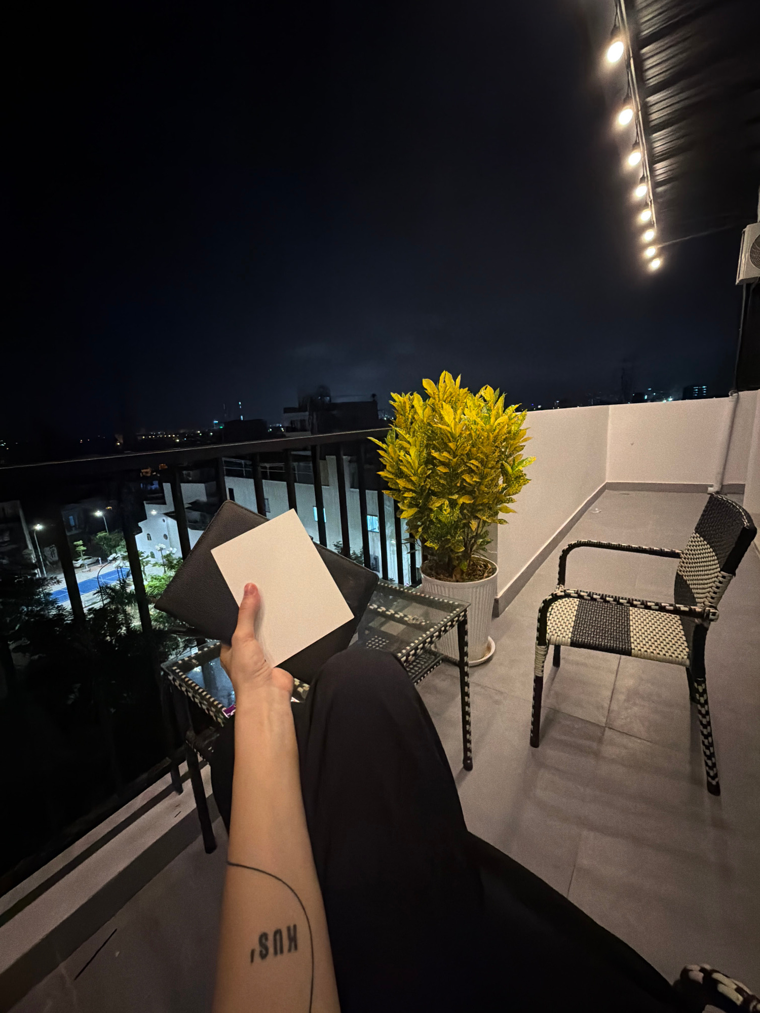 Captured in a high-angle shot, the photograph depicts a nighttime balcony scene in Đà Nẵng, Vietnam. An individual is seated, dressed in black, holding a white square card above a black object in thei…read more