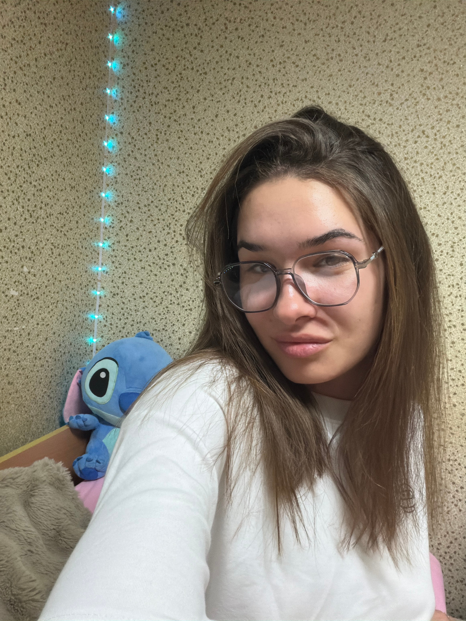 A woman is shown in a selfie, wearing glasses and a white shirt. Her hair is brown and styled loosely around her face. To her right is a stuffed blue character toy, likely Stitch from Disney's Lilo &…read more