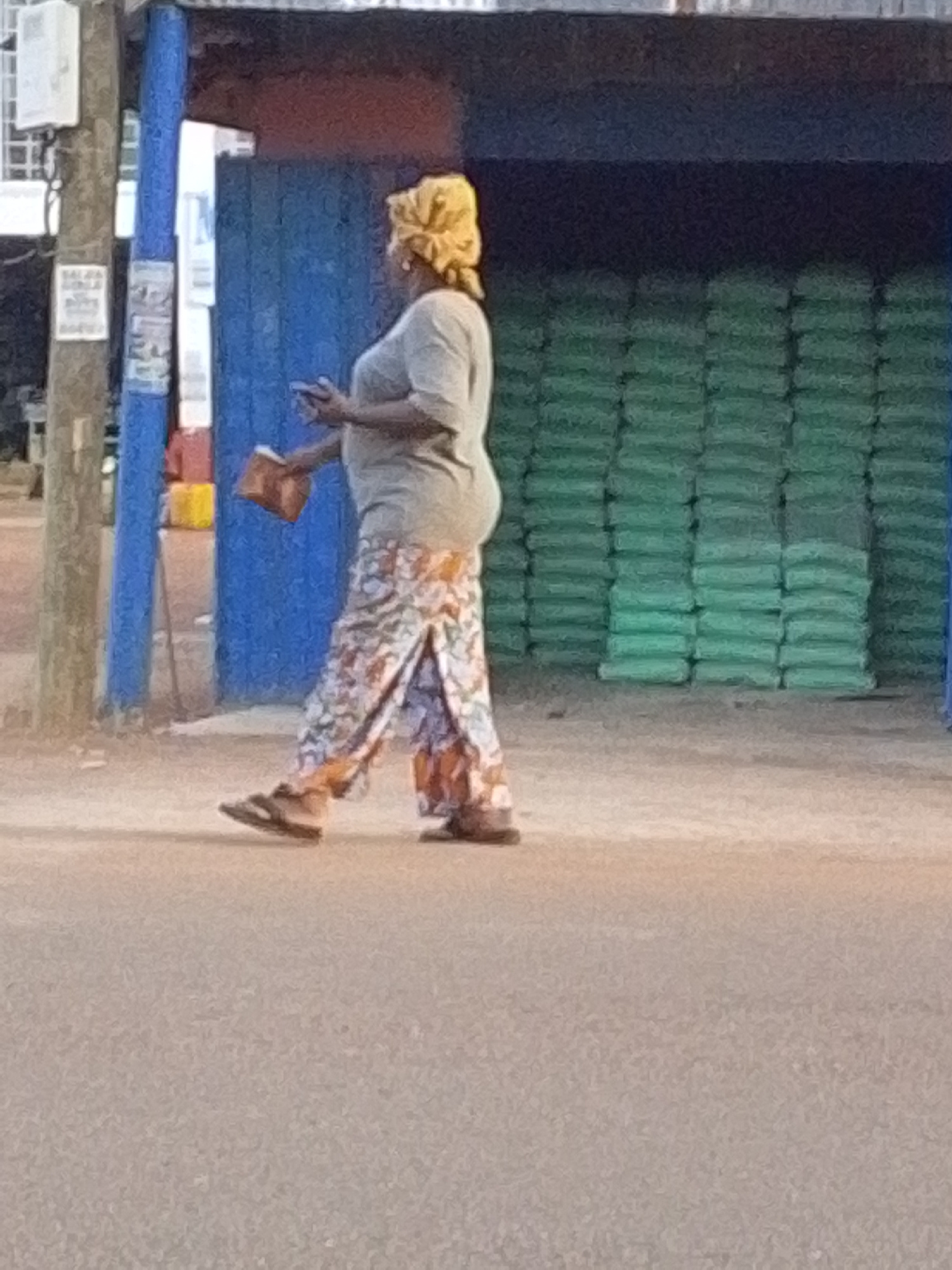 A woman is walking in Tamale, Ghana. She is wearing a grey t-shirt, floral print pants, and sandals. She has a yellow headscarf on. She is carrying a brown object. In the background are stacks of gree…read more