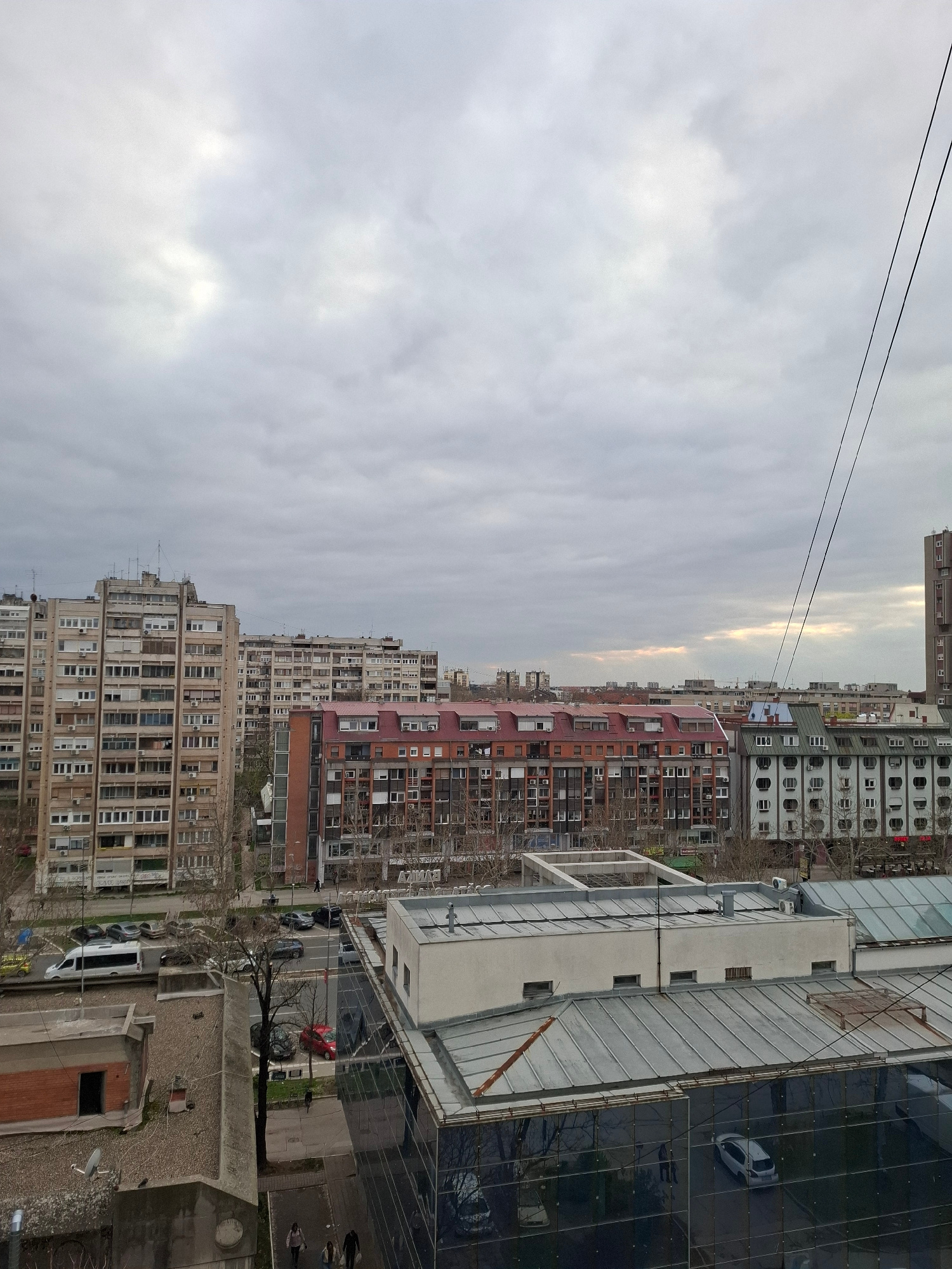 The image presents an urban landscape dominated by residential and commercial buildings in Novi Sad, Serbia. The sky is overcast. There are numerous high-rise apartment blocks of varying ages and arch…read more
