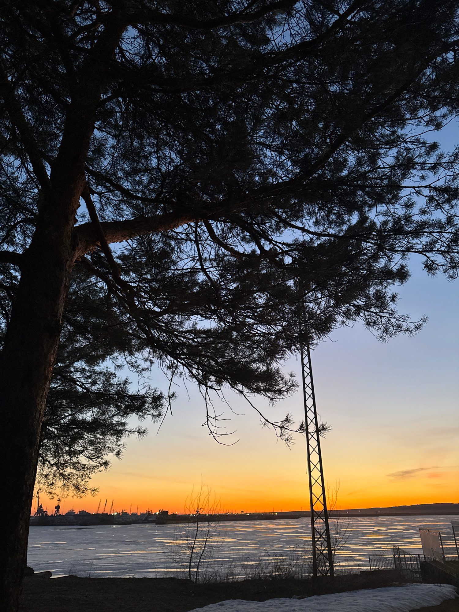 The image, oriented upright, captures a tranquil winter sunset or sunrise over a large body of water, likely a river or lake, in Chaikovsky, Russia. Dominating the left and foreground are the dark, si…read more