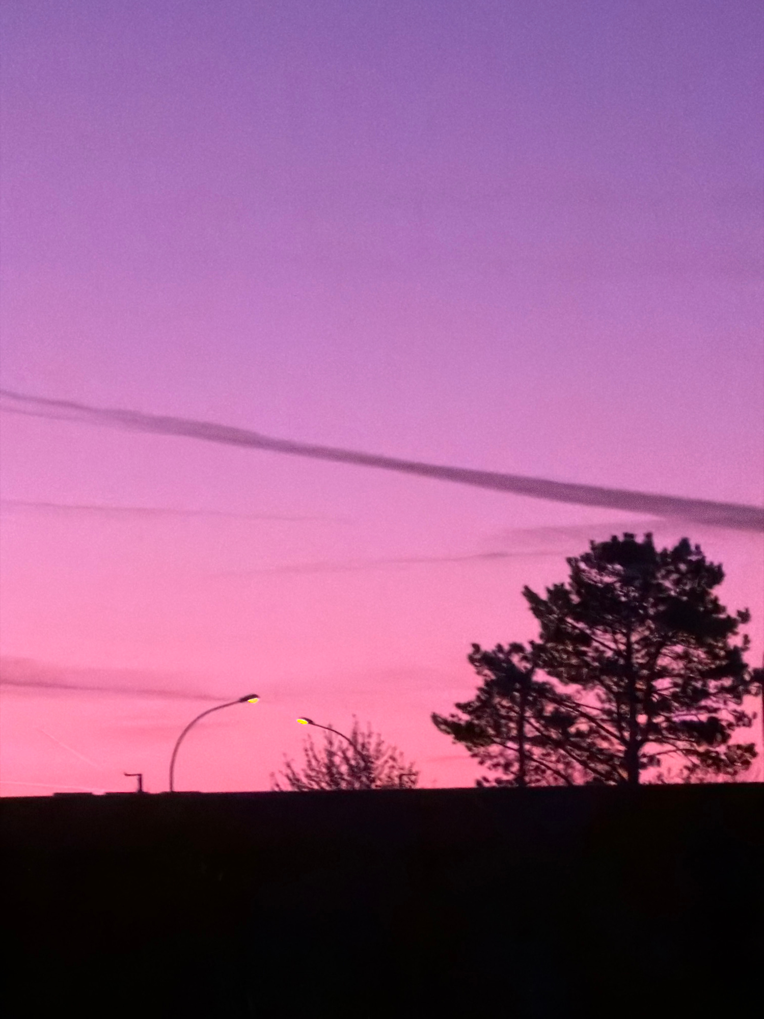 The image shows a sky with a gradient of purple and pink hues at twilight or dusk, likely observed near the city of Leudelange, Luxembourg. A tree silhouette is visible on the right side, alongside a…read more