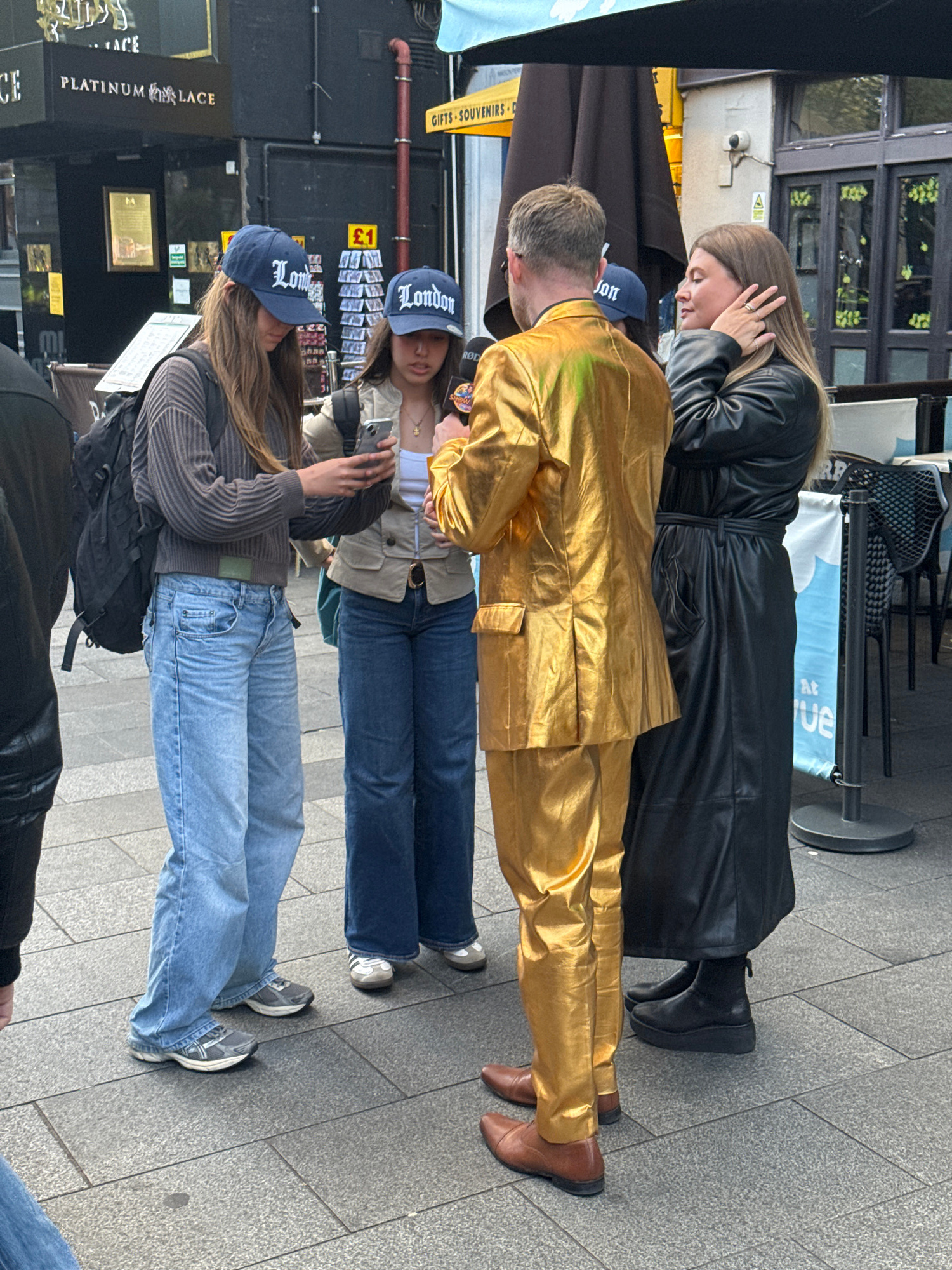 The image captures a group of people standing on a tiled city pavement near a store, likely in London, United Kingdom, based on the signage and style. Four people are predominantly featured: one in a…read more