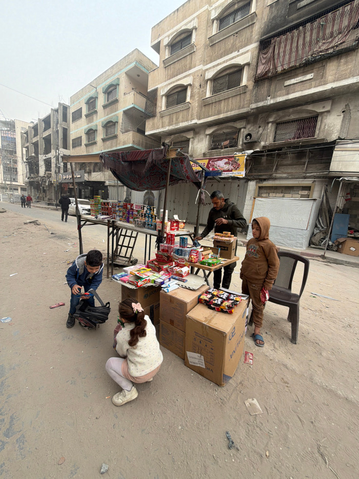 Children gather around a makeshift street vendor selling snacks and sweets. Three kids are inspecting the merchandise, while another kneels on the ground near a backpack. Buildings line the street, so…read more