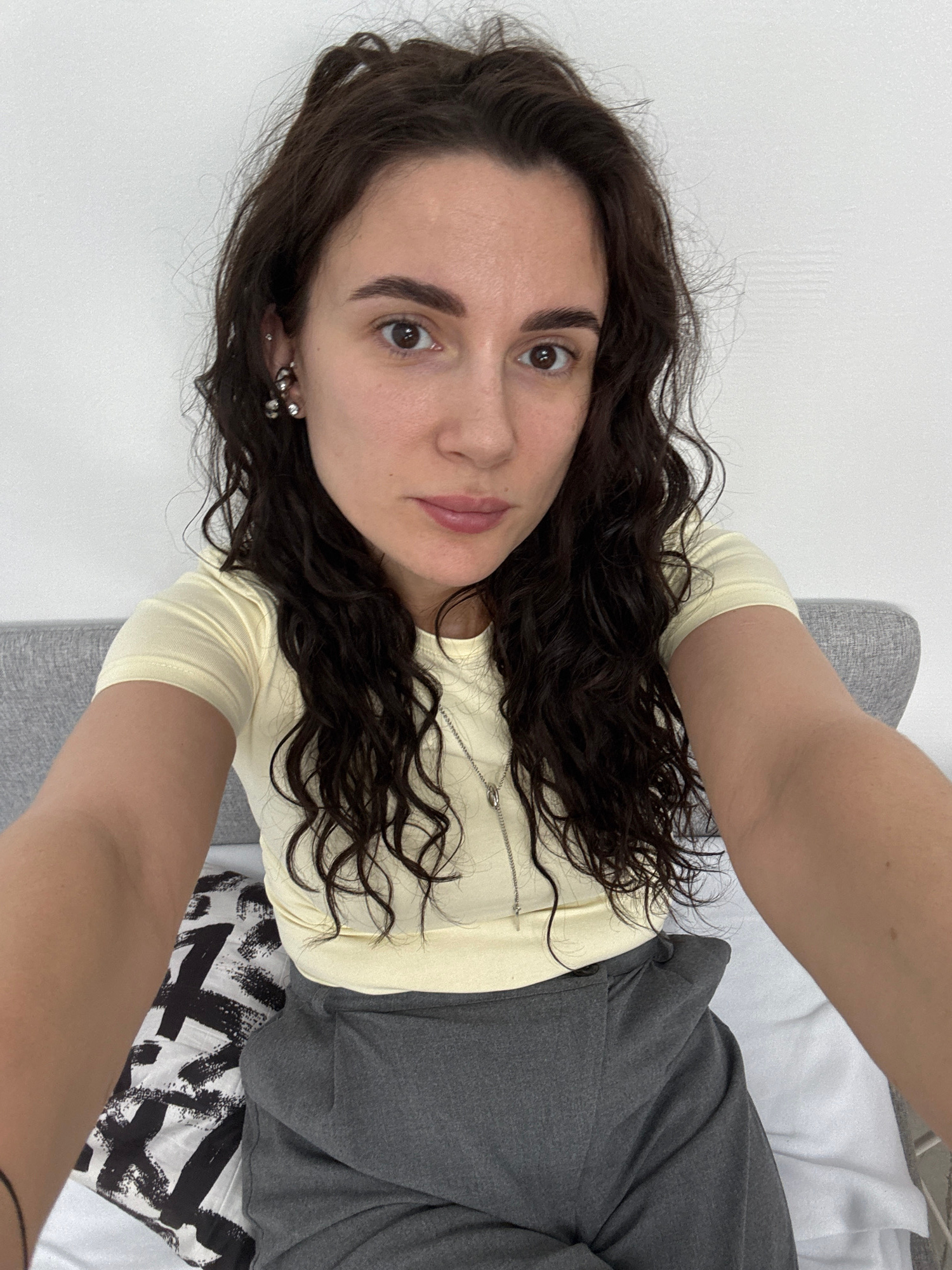 A young woman with long, dark, wavy hair is depicted taking a selfie indoors, appearing to be lying down or leaning back. She has dark eyes and eyebrows, with a neutral expression and slightly parted,…read more