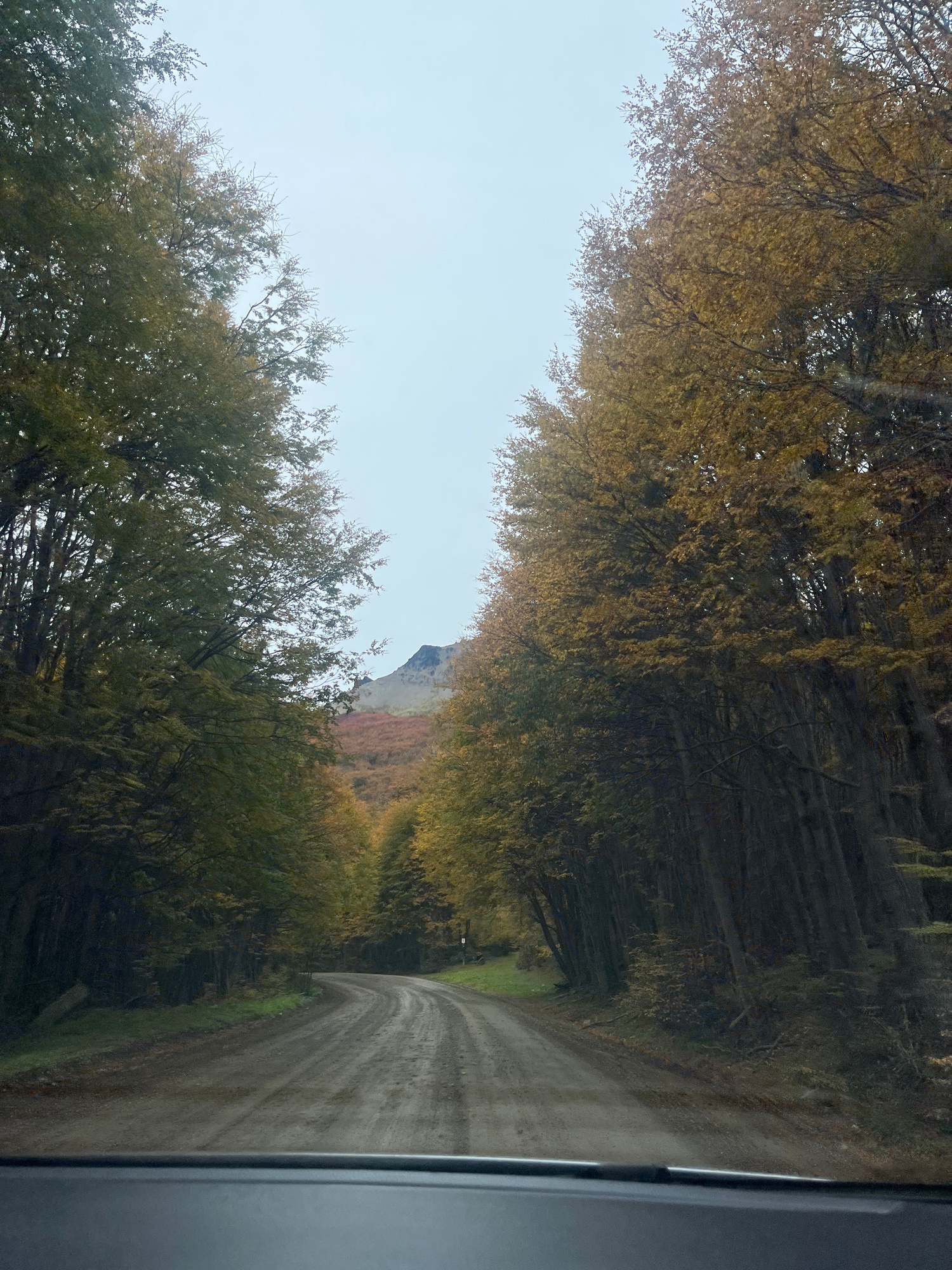 The image depicts a dirt road lined by trees with foliage, likely in autumn colors, and the view is presumably taken from inside a vehicle, as suggested by a partial car window frame on the right side…read more