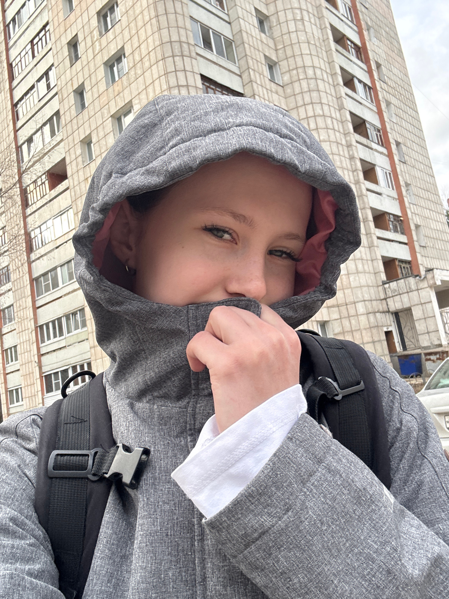 A close-up portrait features a young person, likely female, wearing a grey hooded jacket with a visible pink lining. Their left hand pulls the front of the jacket up to cover their mouth and nose, lea…read more