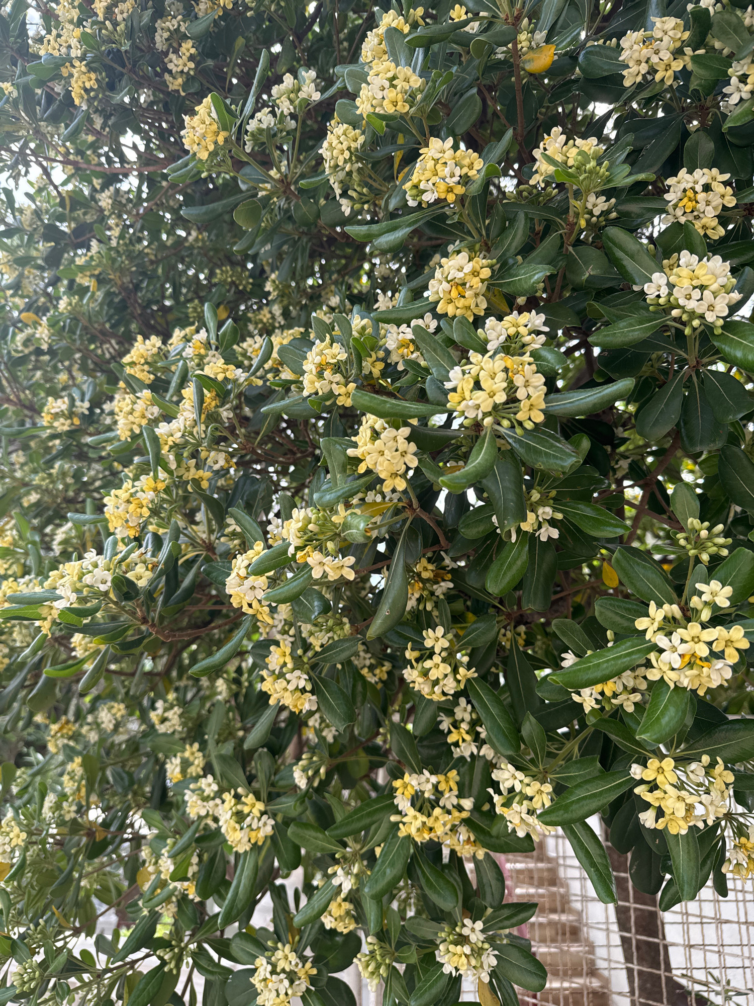 The image shows a flowering bush or tree with small, glossy, dark green leaves and clusters of tiny, pale yellow and white flowers. The arrangement is dense, with the flowers appearing prolifically th…read more