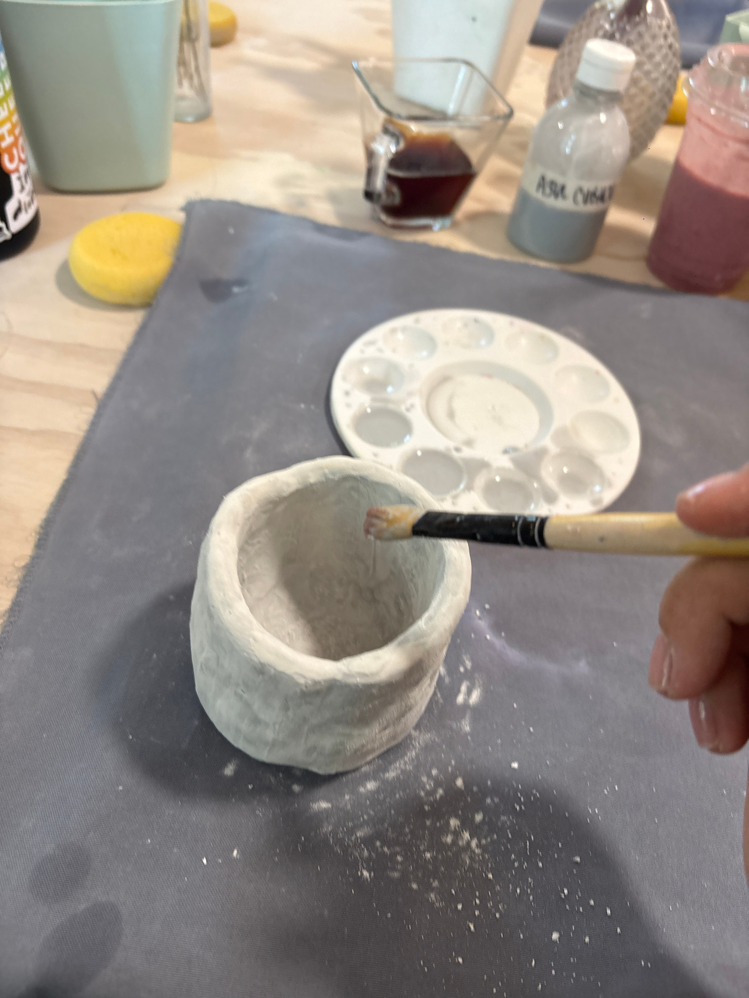 A close-up shot displays an artistic scene with a predominantly gray and white color palette. A hand holds a paintbrush over a small, white, textured bowl, as if in the process of painting. A white pa…read more