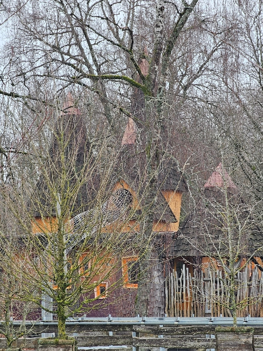 The image displays a multi-turreted structure, partially obscured by numerous bare deciduous trees, under an overcast sky in Esch-sur-Alzette, Luxembourg. The building, identified as likely being with…read more