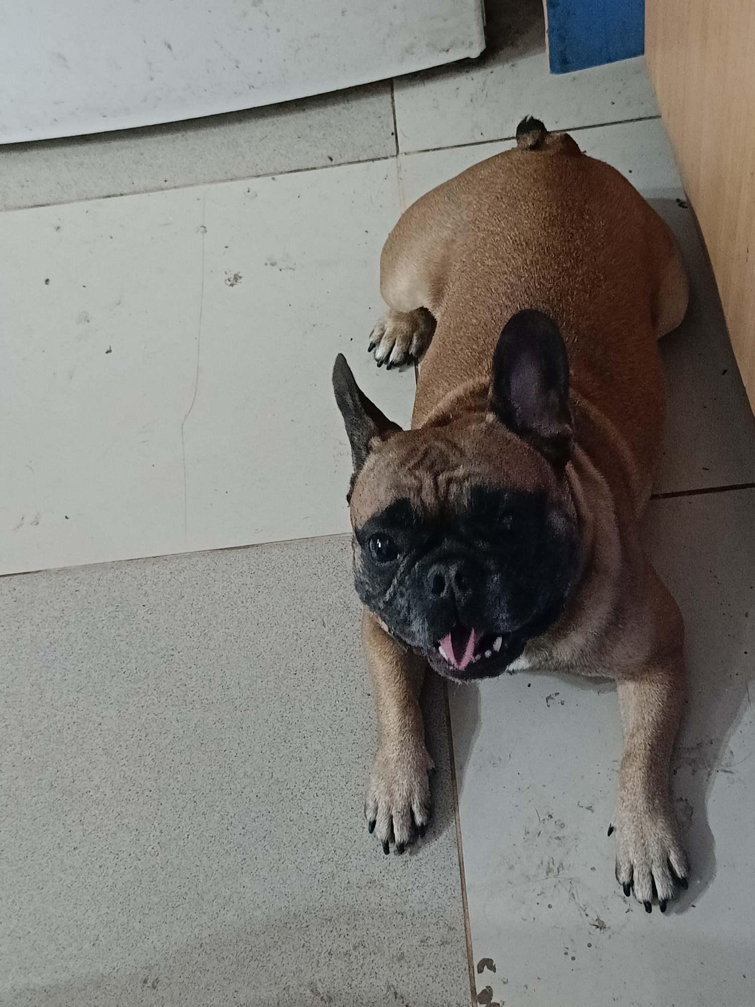 A fawn-colored French Bulldog with a black mask lies on a tiled floor. The dog is panting, with its tongue visible. The surrounding environment includes a white surface, possibly a piece of furniture,…read more