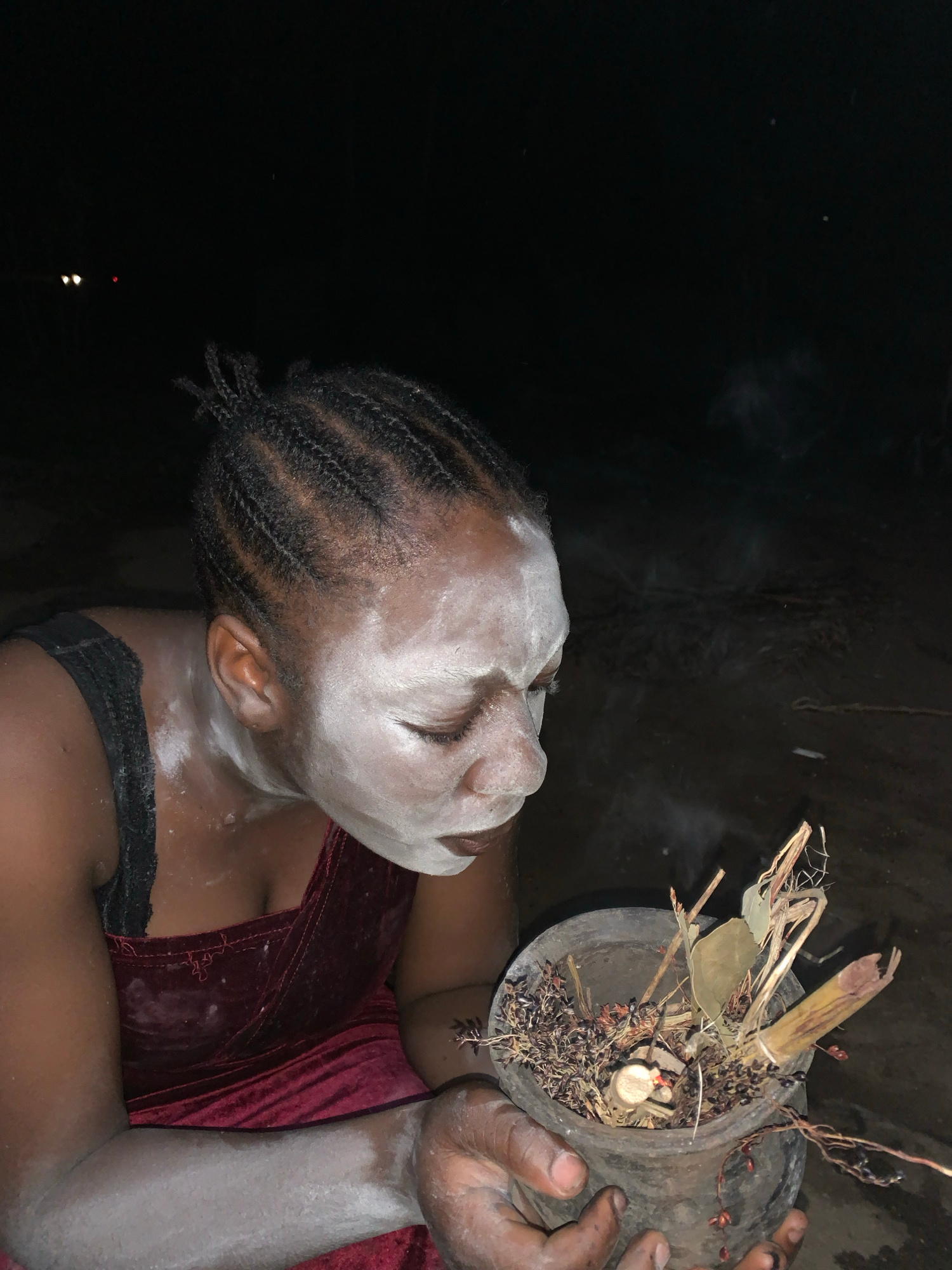 The image depicts a person with dark skin, their face and exposed skin covered in white powder, holding a dark gray pot filled with dry plants, twigs, and small seeds. The person is wearing a maroon v…read more