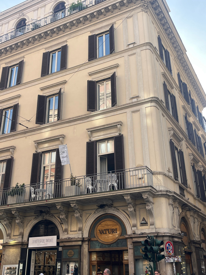 The image displays a multi-story, cream-colored building situated at the intersection of Via Condotti and Largo Carlo Goldoni in Rome, Italy. The building features classical architectural details, inc…read more