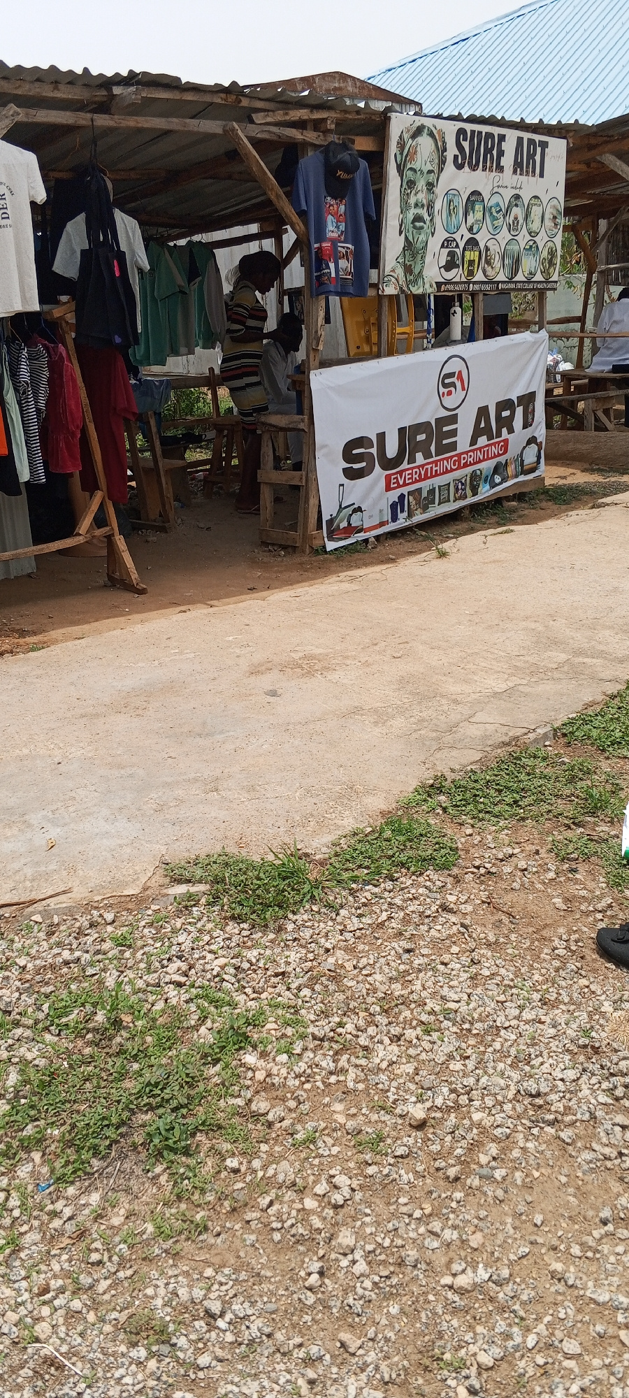 The image shows a roadside stall in Keffi, Nigeria. The stall is constructed of wood and corrugated metal, displaying clothing and artwork for sale. A sign prominently reads "SURE ART EVERYTHING PRINT…read more