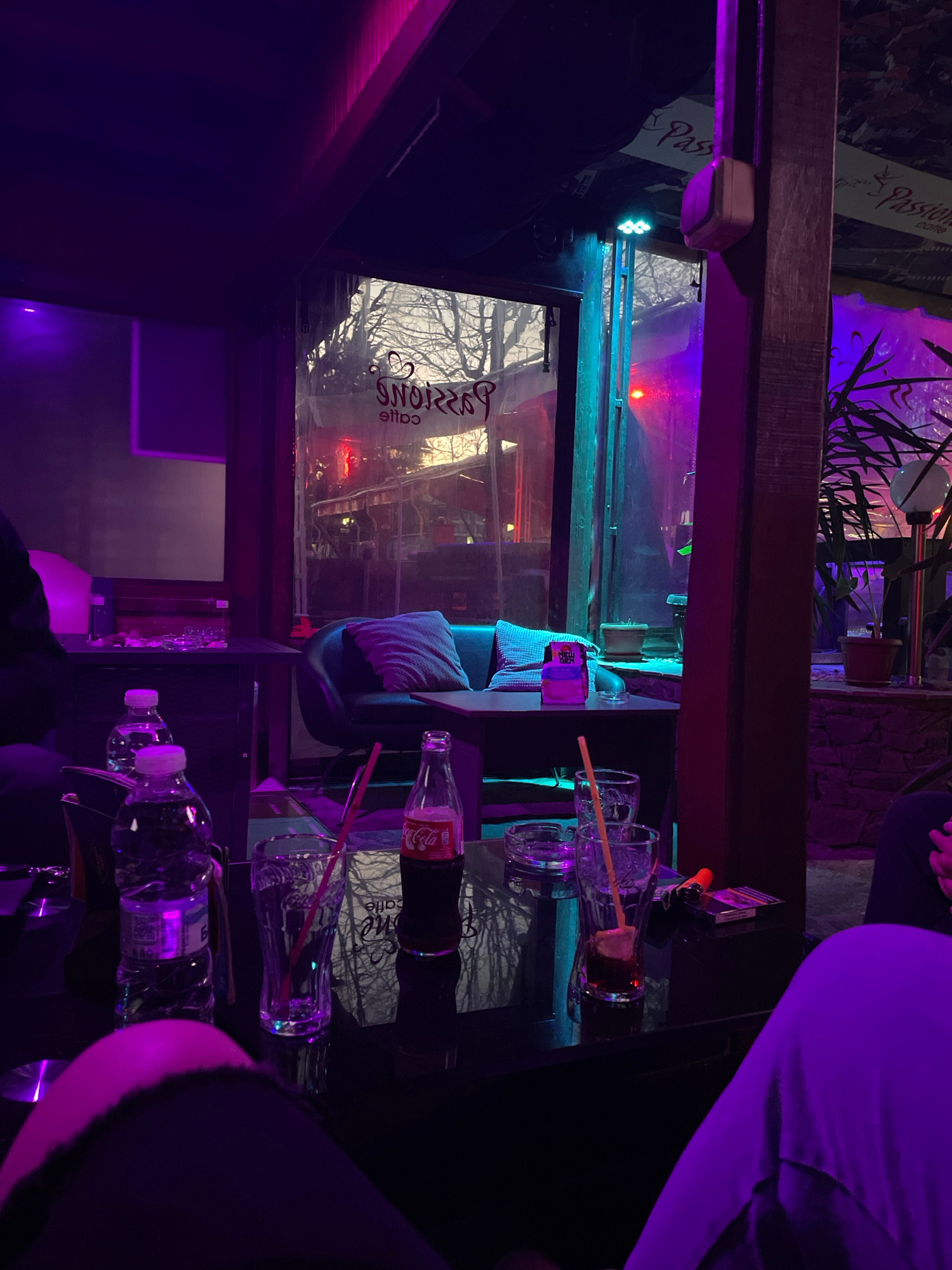 The image depicts an indoor scene in what appears to be a bar or café, evidenced by the presence of bottles of water, Coca-Cola, and glasses. The interior is illuminated with purple and blue lighting,…read more