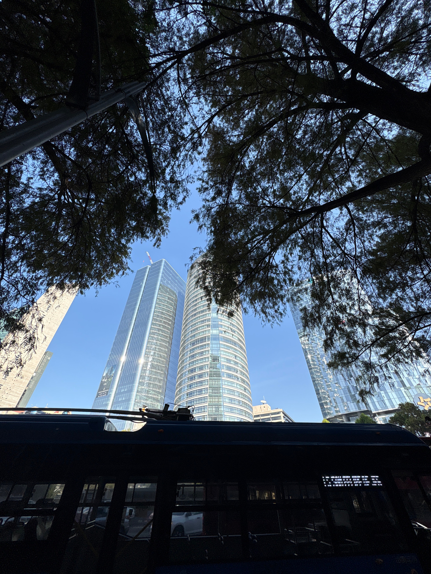 A low-angle urban scene displays multiple modern skyscrapers under a clear blue sky, viewed through a dense canopy of silhouetted trees and over the dark upper structure of a public transport vehicle.…read more