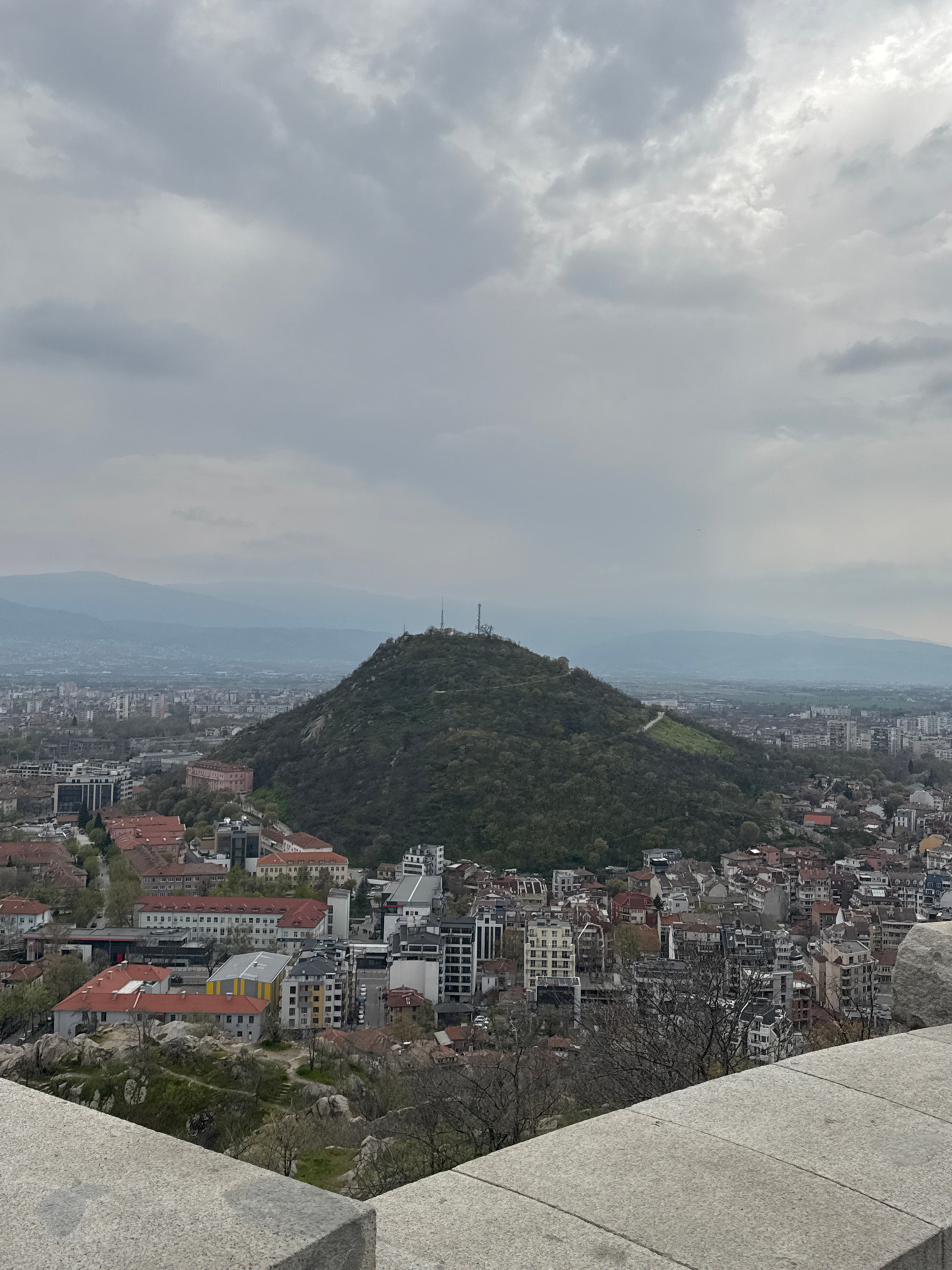 The image shows a cloudy, overcast day overlooking the city of Plovdiv, Bulgaria. A large, tree-covered hill dominates the center of the frame, with the city sprawling below and beyond it. In the distβ¦read more