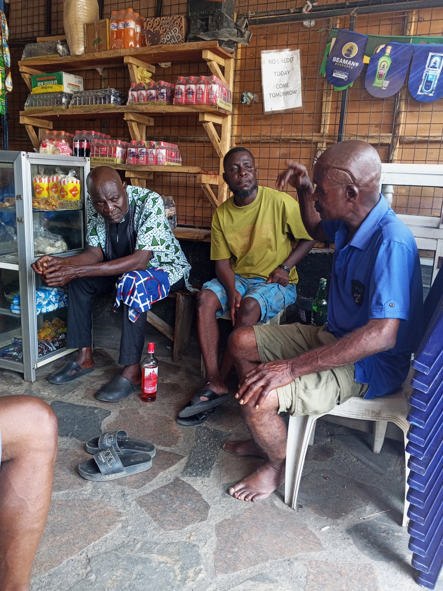 The image depicts three men sitting in a small shop or bar in Zango-ndaji, Nigeria. The man on the left wears a patterned shirt and black pants and sits next to a display case filled with snacks and d…read more
