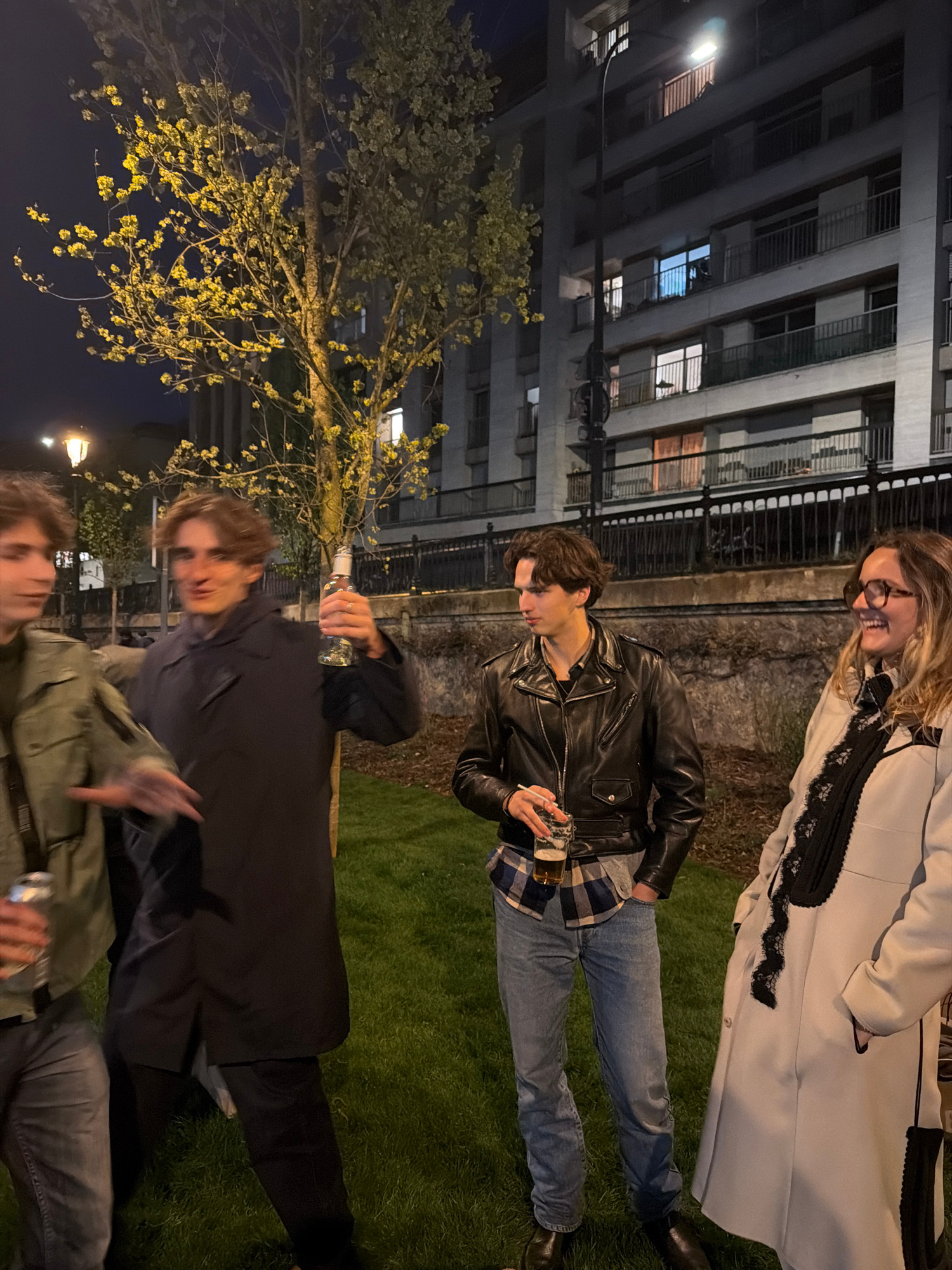 The scene is an outdoor gathering at night. A woman in a white coat with black trim is standing on grass, alongside a man in a black leather jacket, who is holding a glass. A third man in a black coat…read more
