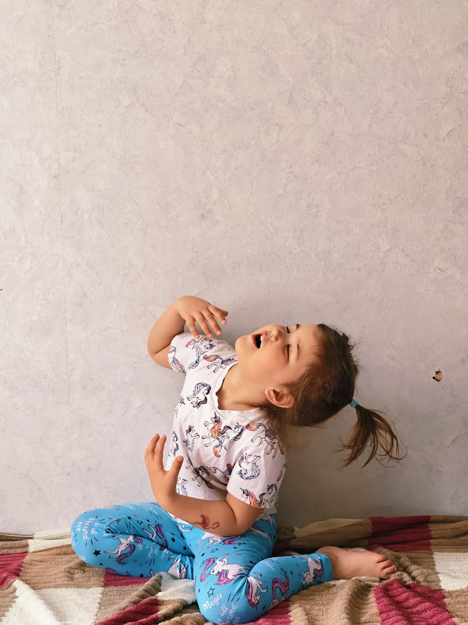 A young girl with brown hair in a ponytail is sitting cross-legged on a blanket with a plaid pattern in shades of white, tan, and red. She is wearing a white T-shirt with a unicorn pattern and blue pa…read more