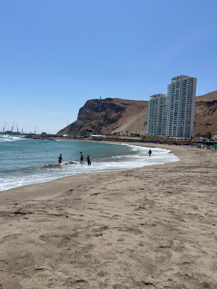 The image displays a sunny coastal scene in Arica, Chile. In the foreground, dark, damp sand extends across the frame, bearing visible footprints. The midground features the Pacific Ocean's greenish-b…read more