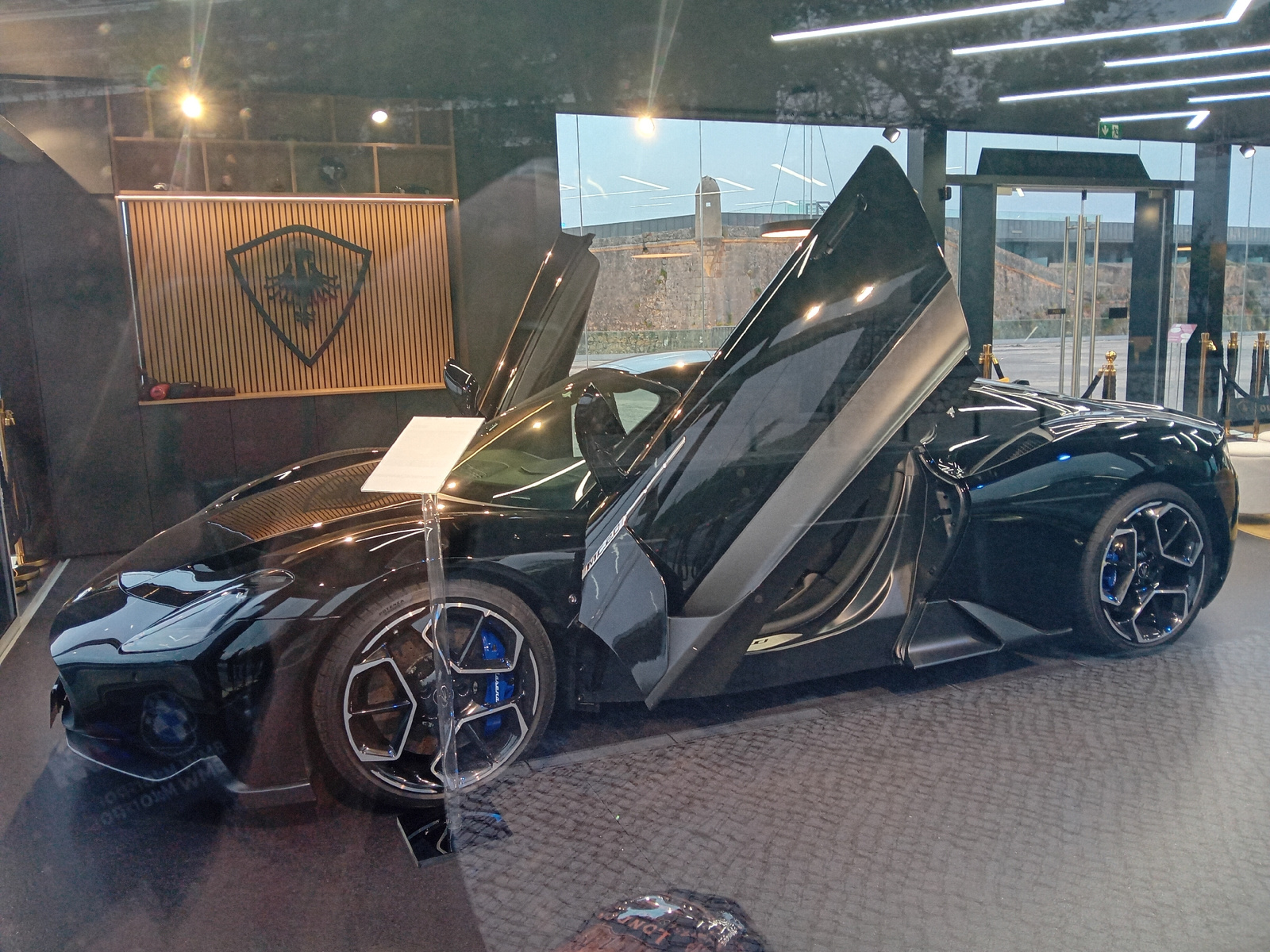 The image shows a black Maserati MC20 sports car with butterfly doors open, displayed indoors. The car is in what appears to be a showroom or event space, evident from the patterned floor, interior li…read more