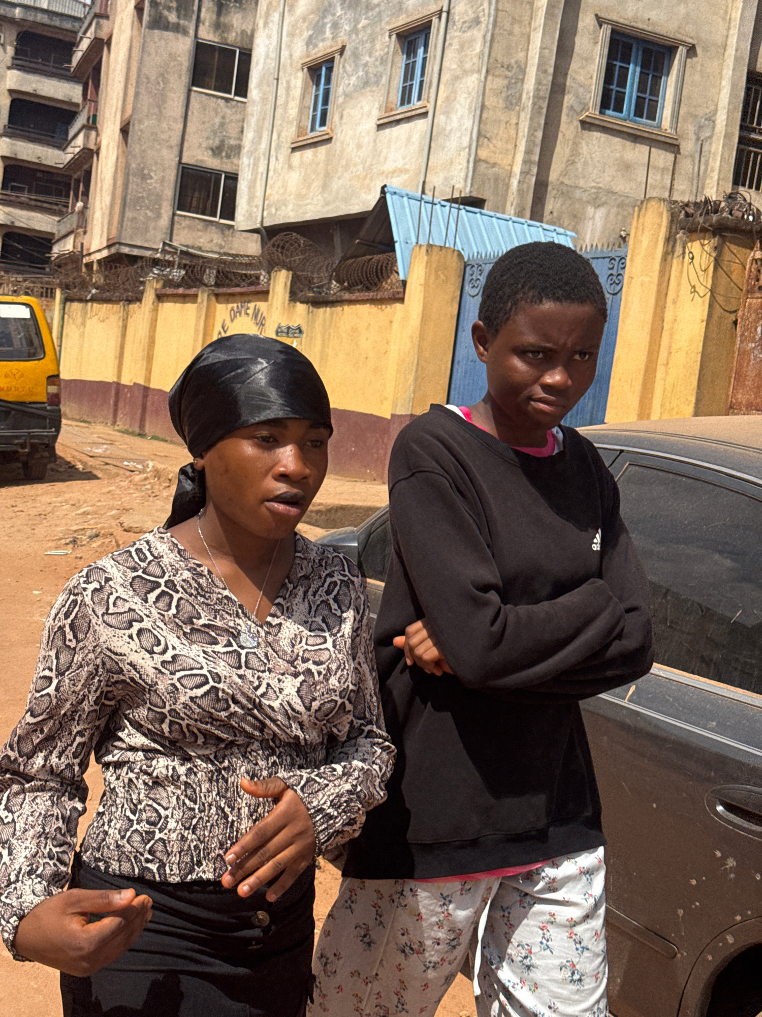 This outdoor portrait features two individuals posing in what appears to be an urban or semi-urban setting in Onitsha, Nigeria, under bright daylight. In the foreground, a young woman is seen from th…read more
