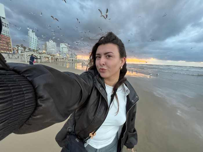 An upside-down selfie shows a woman on a beach against a cityscape. She wears a black jacket over a white shirt. The sky is cloudy with some birds flying. Buildings appear reflected in the water. Ocea…read more