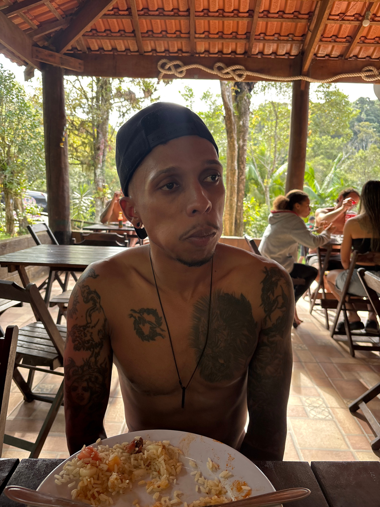 A medium, eye-level, full indoor/outdoor shot depicts a man, with his head and upper torso visible. He has light brown skin, dark eyes, and is wearing a black cap. He has a thin mustache and goatee. T…read more