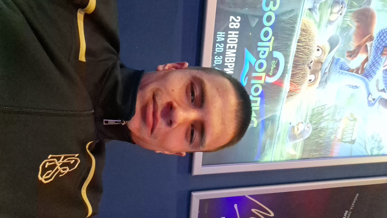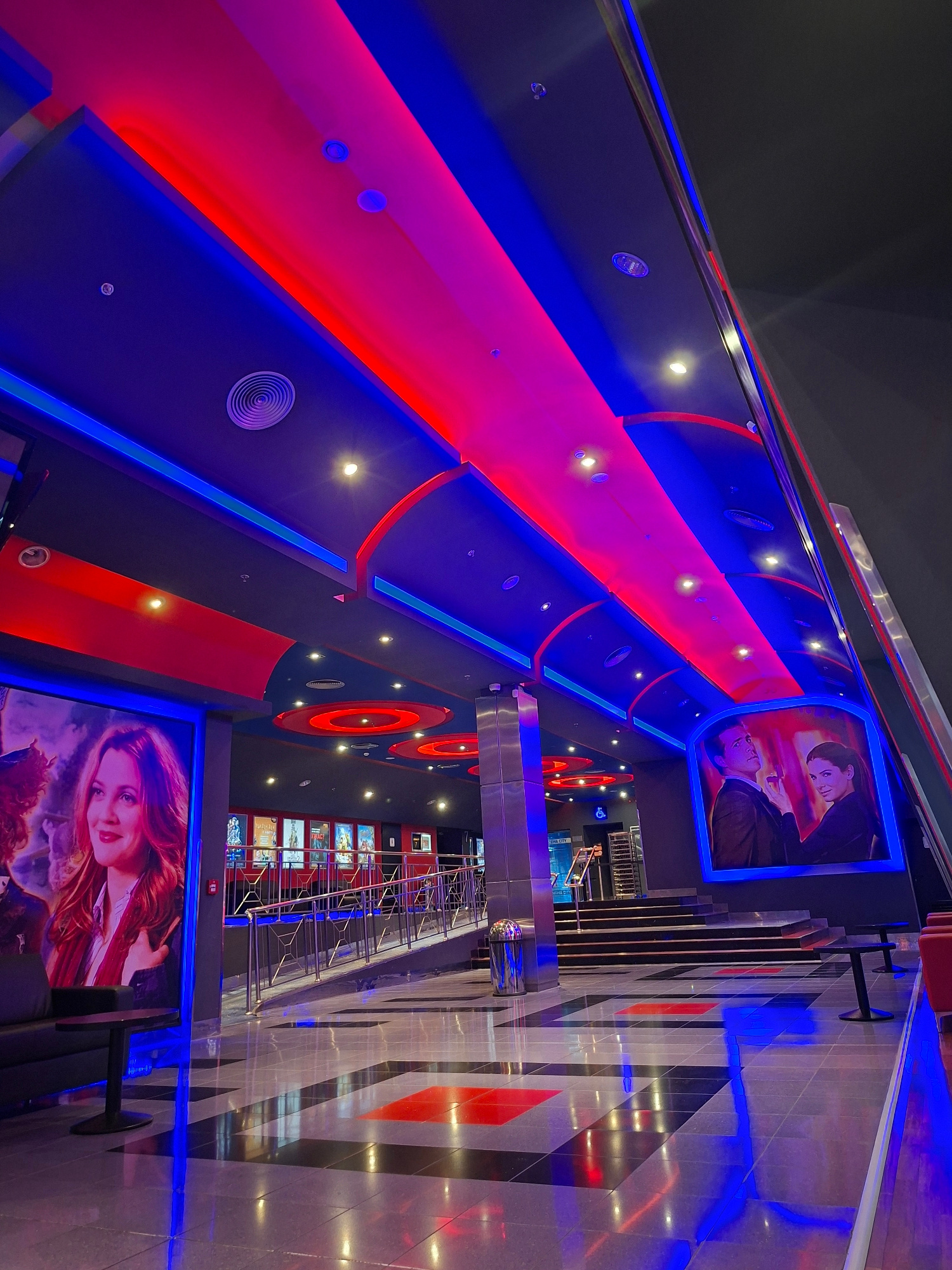 The image shows the interior of a modern cinema complex, likely located in Stara Zagora, Bulgaria. The ceiling is a dark gray with red and blue neon lighting forming a geometric pattern. Small recesse…read more