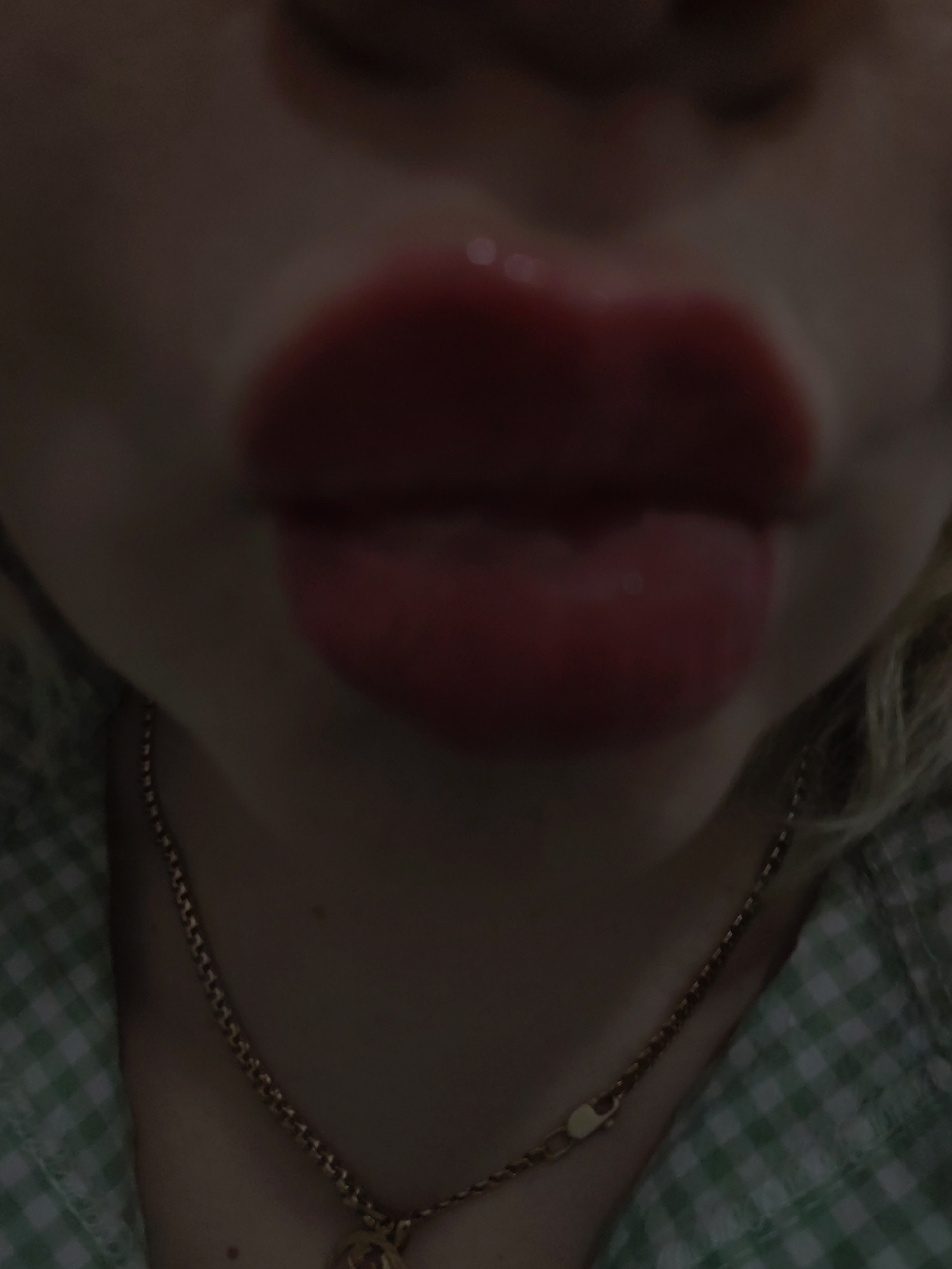 A close-up image focuses primarily on a person's face, specifically the lips. The lips are full and coated with a glossy, red lipstick. Above the lips, the blurry suggestion of a nose is visible. Beloโฆread more