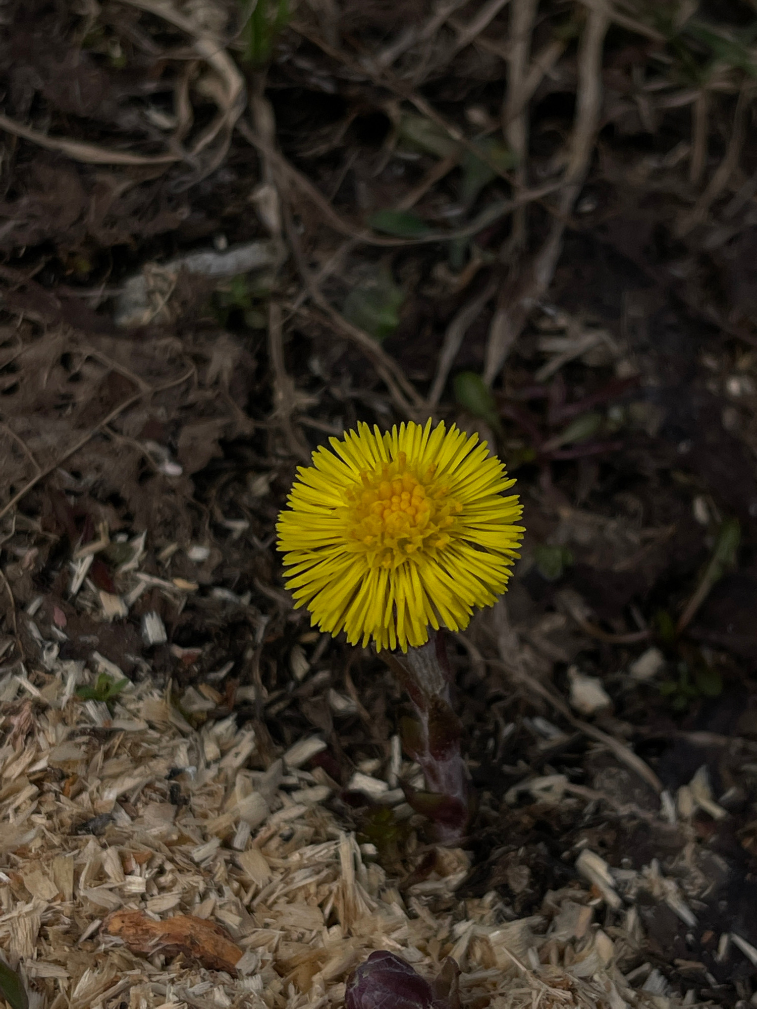 A single yellow flower, likely a Coltsfoot (Tussilago farfara), is centered in the image. It is surrounded by dark, decomposing leaf litter and lighter colored wood chips. The flower is in full bloom…read more
