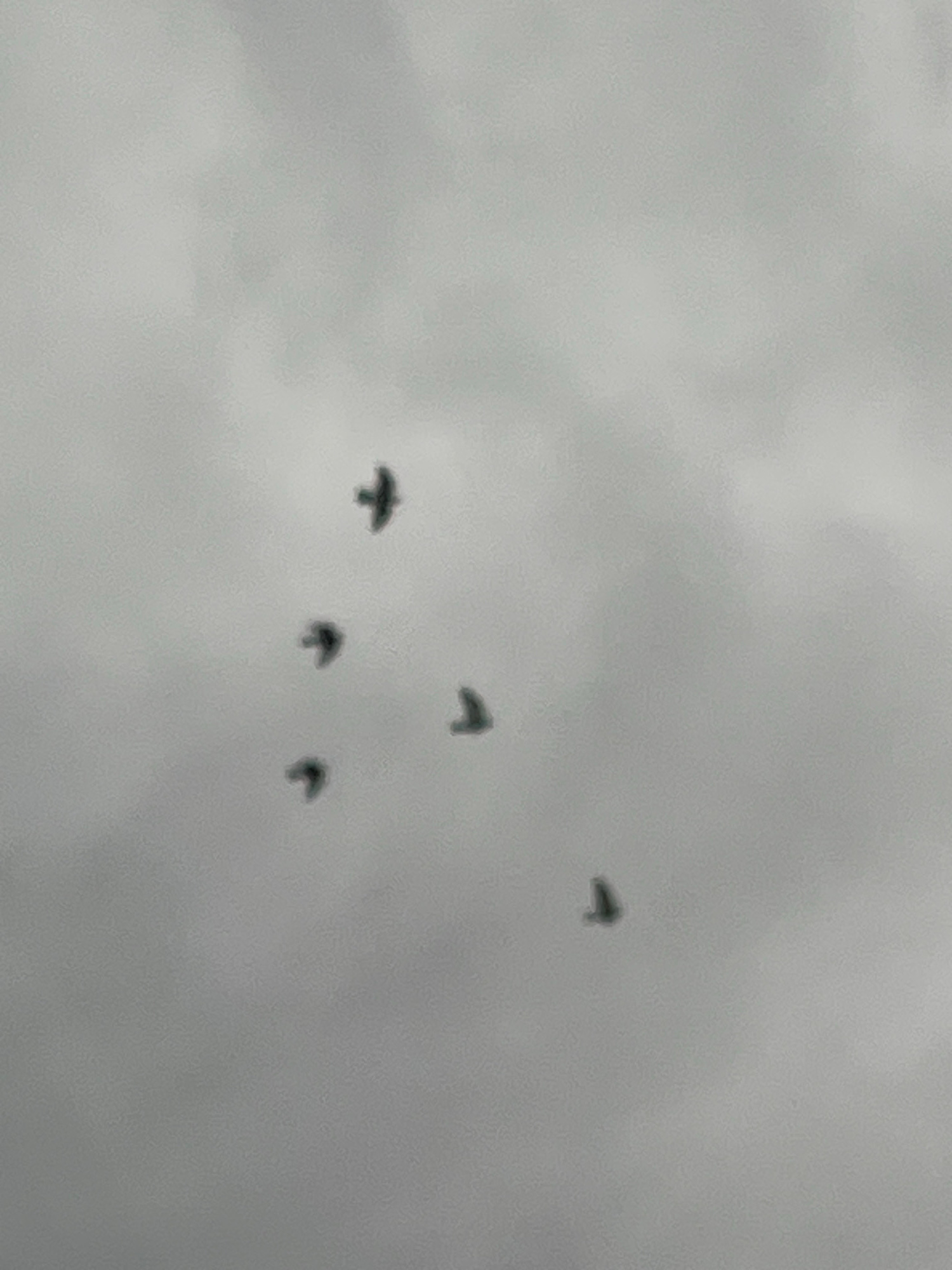 The image depicts five birds in flight against a grey, overcast sky. The birds are silhouetted and appear small in the frame, suggesting they are at a distance. The background is a uniform grey, indic…read more
