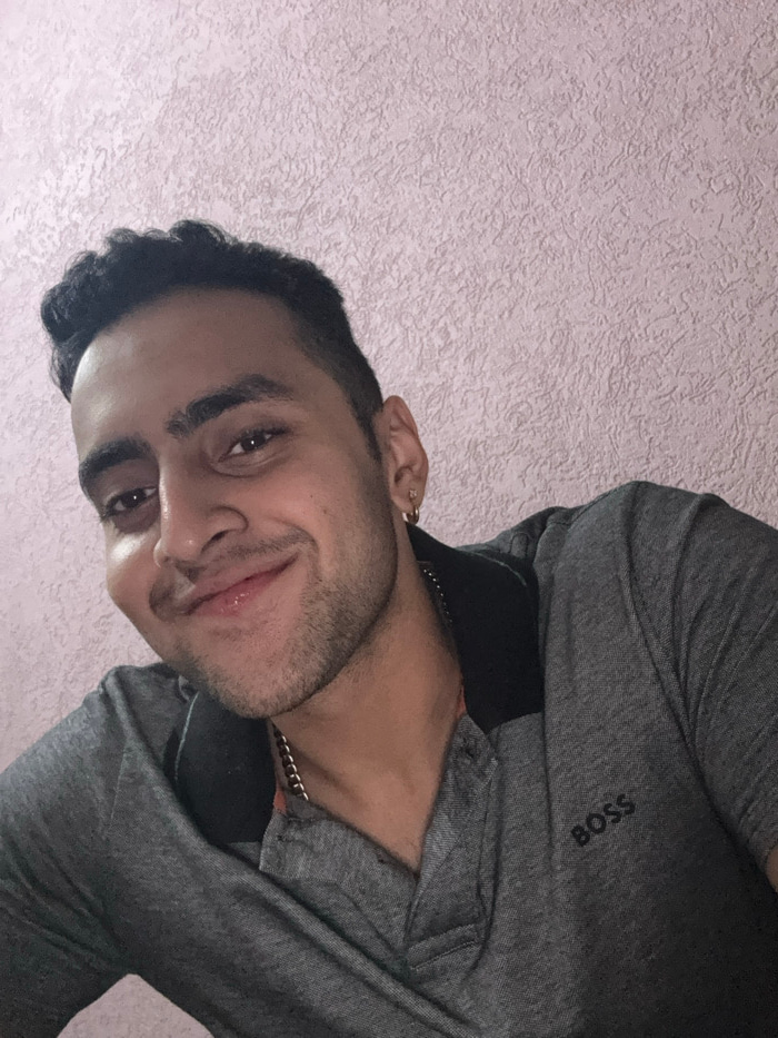 A medium shot captures a smiling man wearing a gray "BOSS" sweatshirt. He has dark hair styled with a slight wave, dark eyes, and a faint shadow of a beard. A silver chain necklace is visible around h…read more