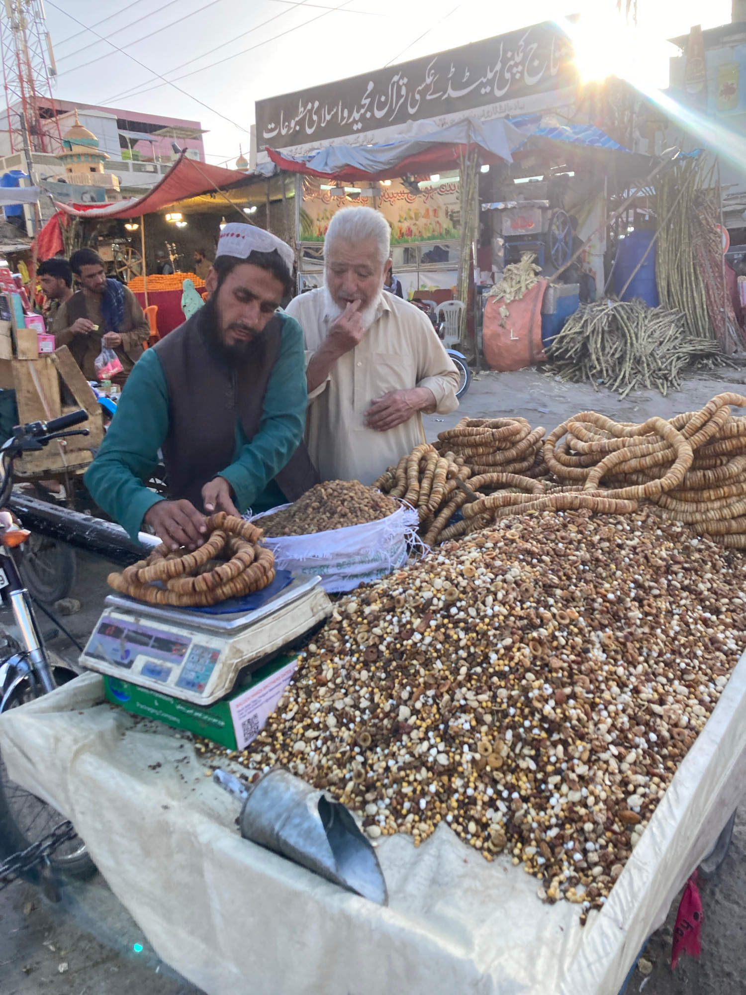 The image depicts a street scene, likely a market, in Quetta City Tehsil, Pakistan. A vendor, wearing a white cap and a green shirt over a vest, is weighing what appears to be dried figs using a digit…read more