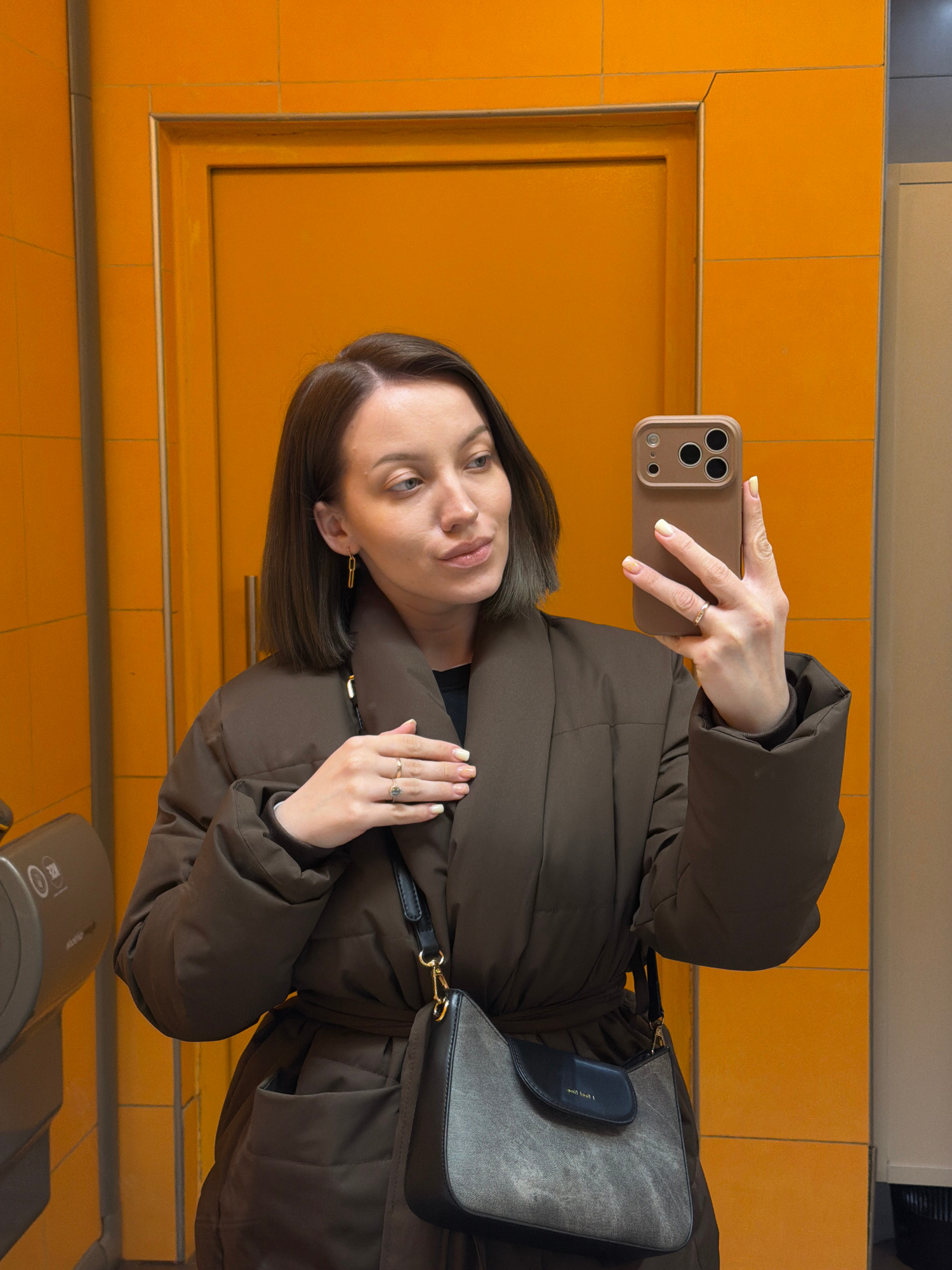 A woman with shoulder-length brunette hair is taking a selfie in a bathroom setting. She wears a brown, puffy jacket and a small grey and black purse hangs off her left shoulder. A gold ring is visibl…read more