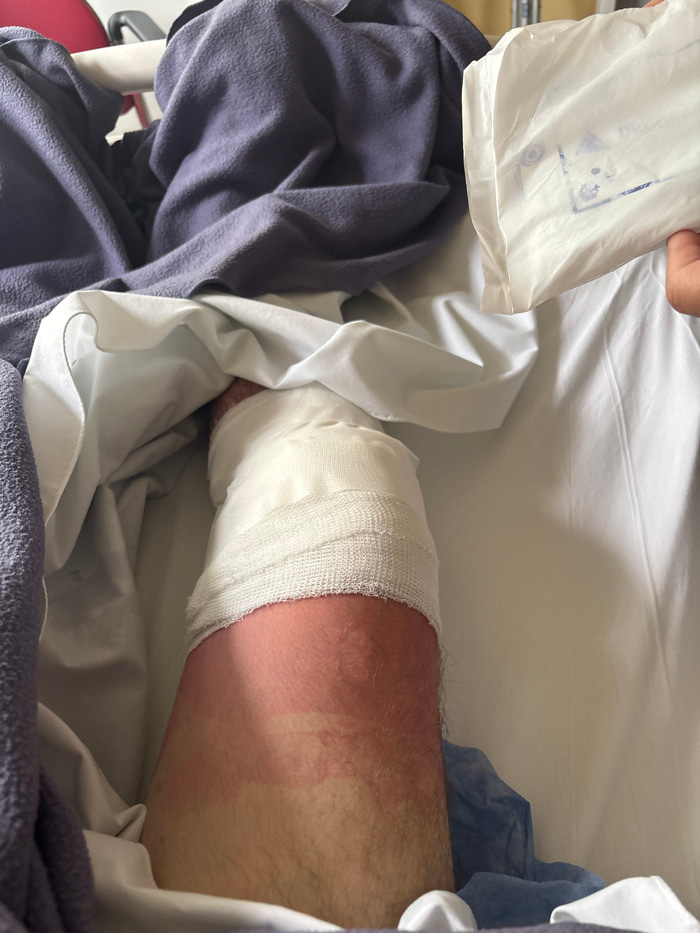 An injured leg wrapped in a white bandage rests on a hospital bed covered in white sheets. A light purple blanket lies beneath the leg, while a white plastic bag is held above the bed. The injured leg…read more