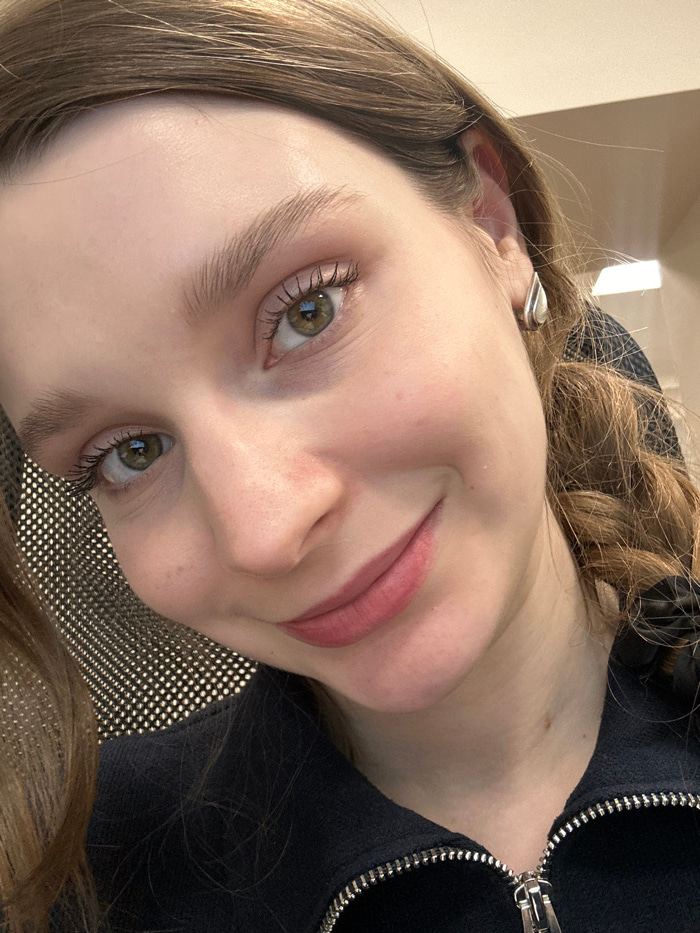 A close-up, eye-level selfie depicts a young Caucasian female in an indoor setting. She has light skin, green eyes with visible eyelashes, and light brown hair partially visible on both sides and brai…read more
